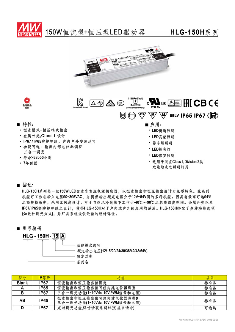 - 应用范围:LED街道照明 ·LED高架照 明停车场照明·LED捕鱼灯·LED温室照明适用于装在Classl,D
