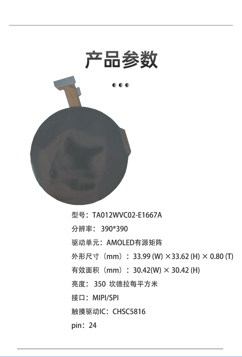 推荐品牌1.2寸AMOLED高清显示屏 350亮度 MIPI接口 390*390/24pin