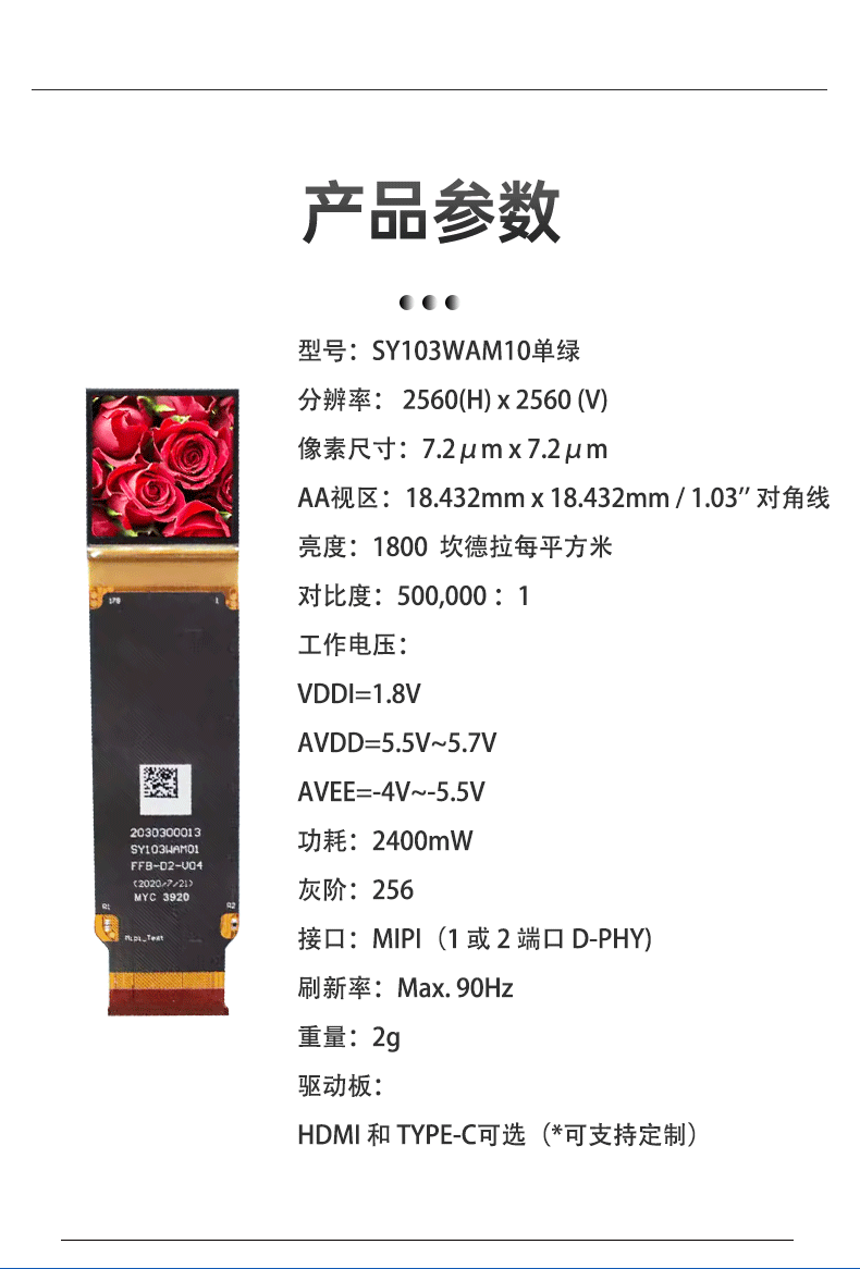 视涯品牌1.03寸显示屏单绿HDMI mini方案2560*2560 81Pin医疗工业
