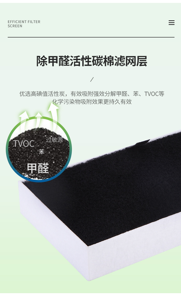 - 功能:集尘除螨、吸附PM2.5/花粉、吸附各类有害气体
