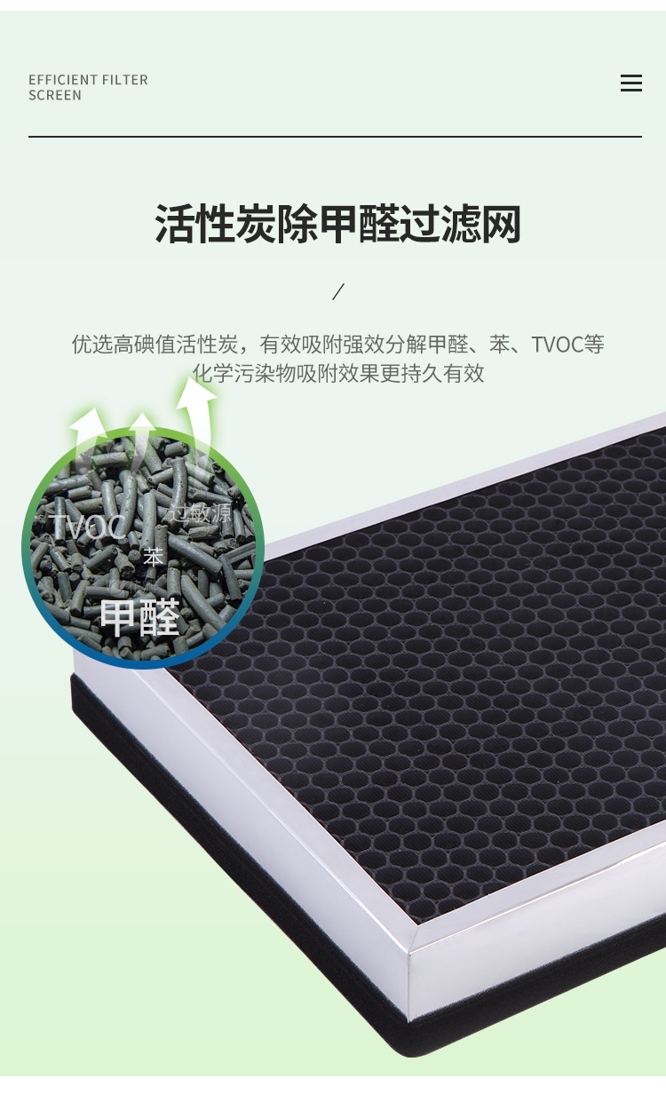 - 功能:除甲醛等污染气体、除烟味/异味、吸附PM2.5/花粉