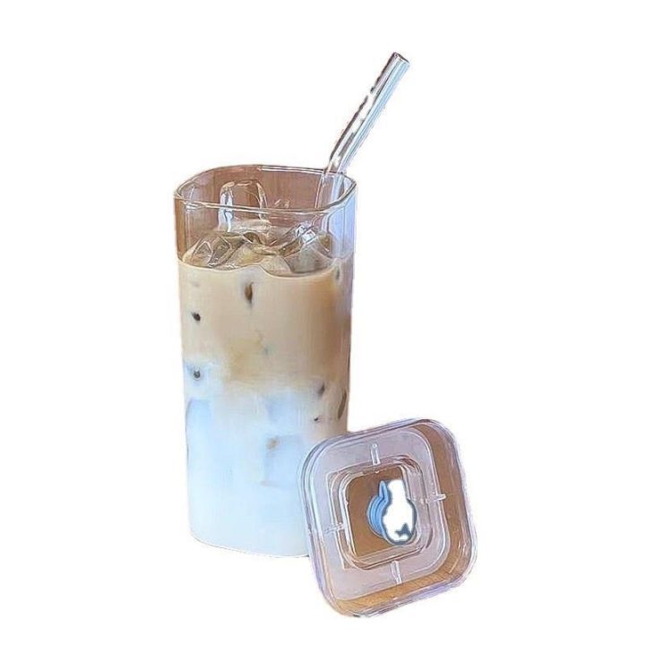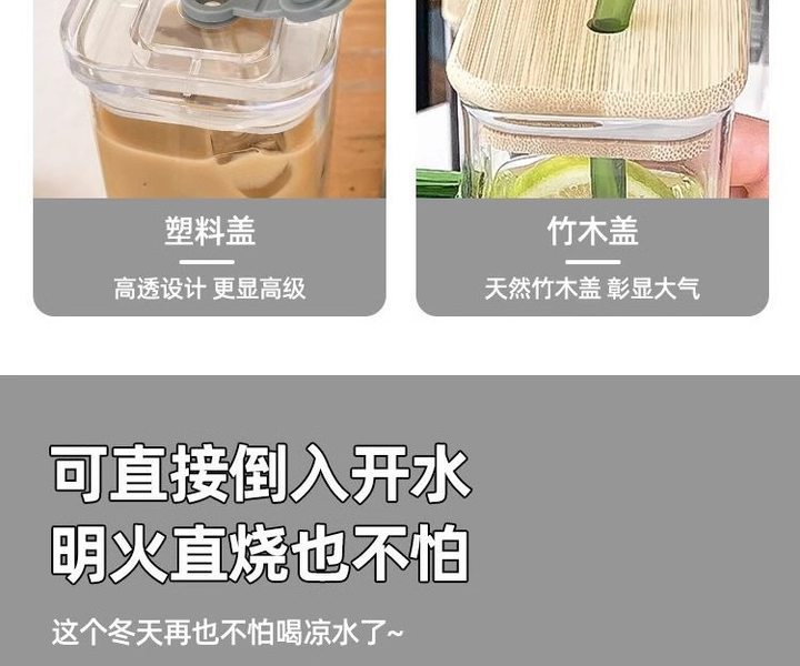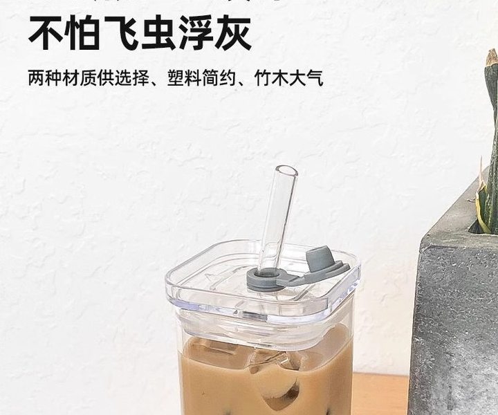 高硼硅方形玻璃水杯带盖防尘带吸管便携式吸管杯高硼硅方形玻璃杯