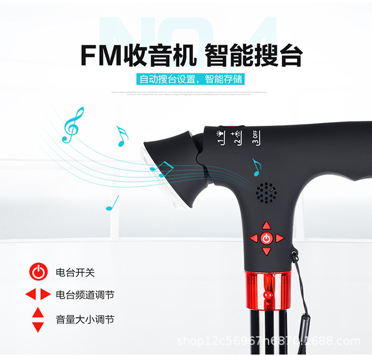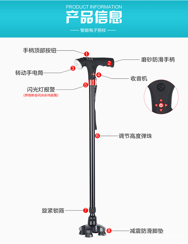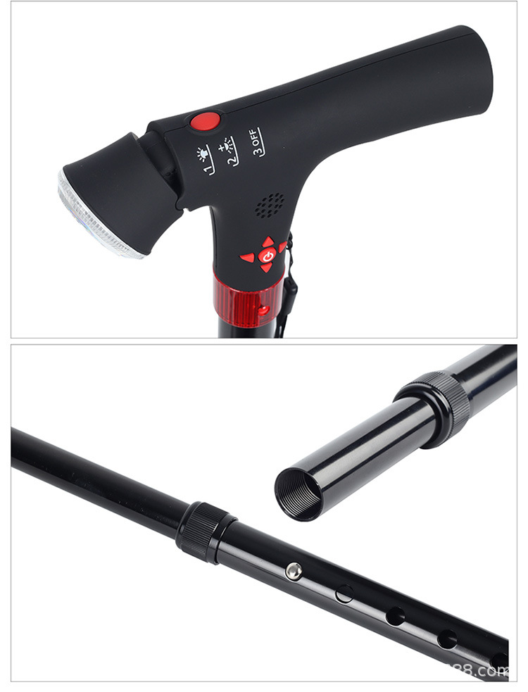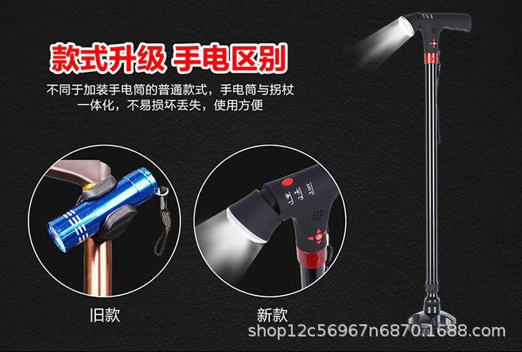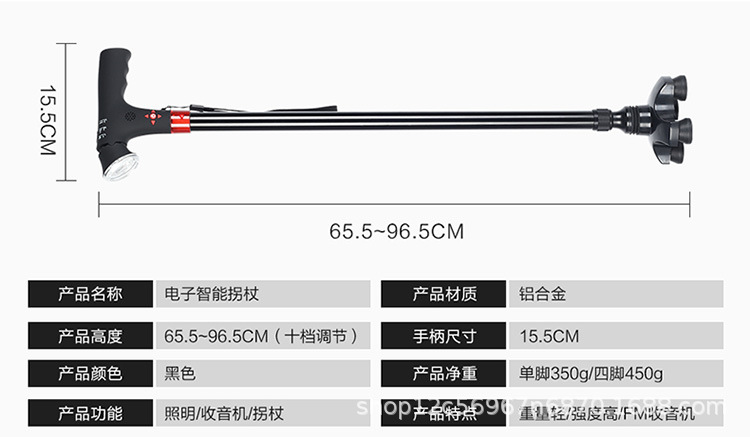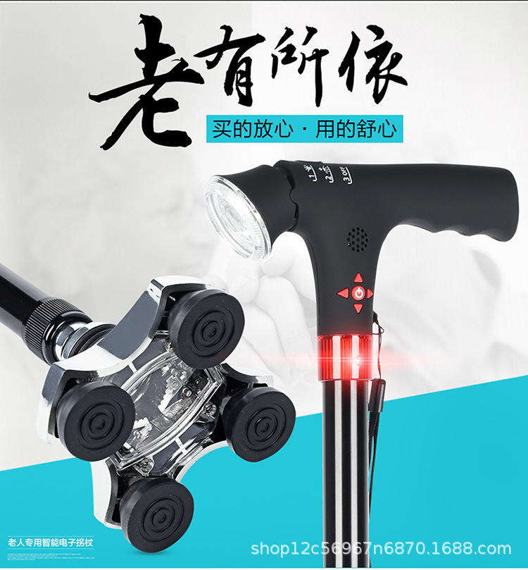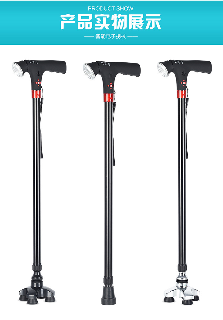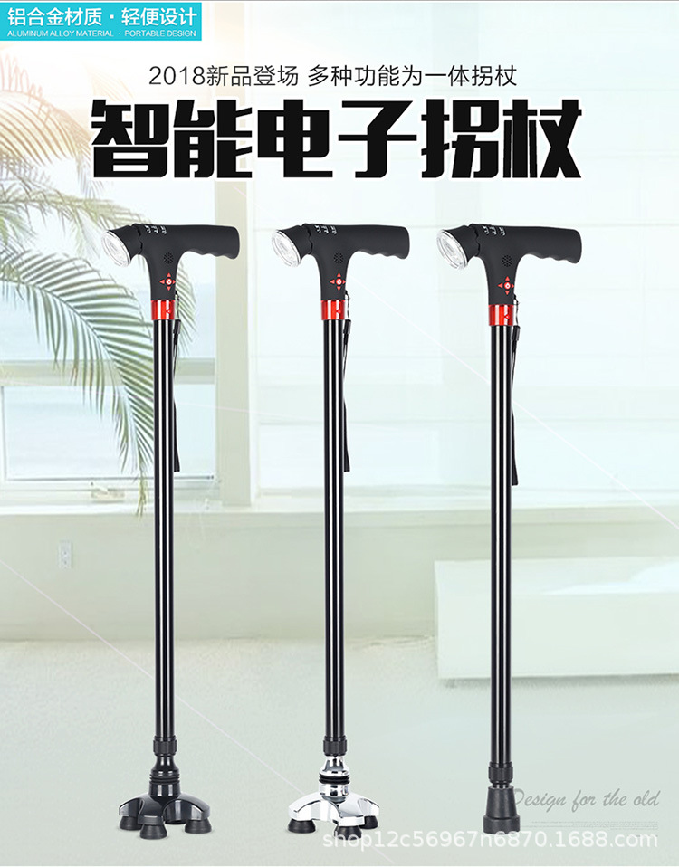 多功能智能手杖老人照明自动报警单脚四脚可更换收音机可调节高度