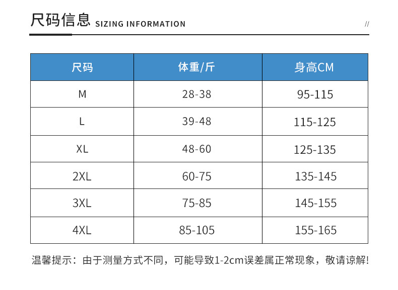 - 尺码:XL(建议身高125-135cm体重48-60斤)
