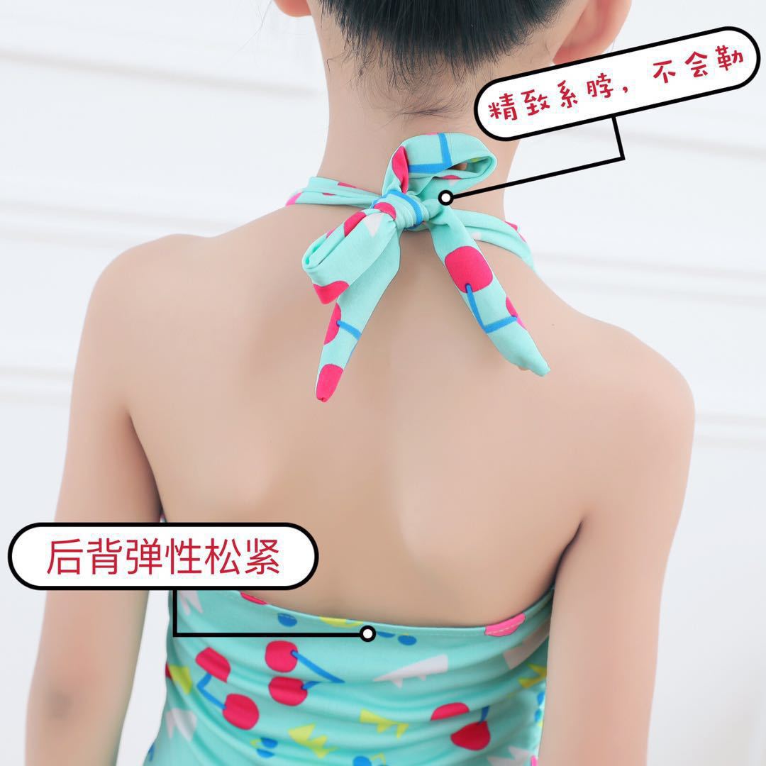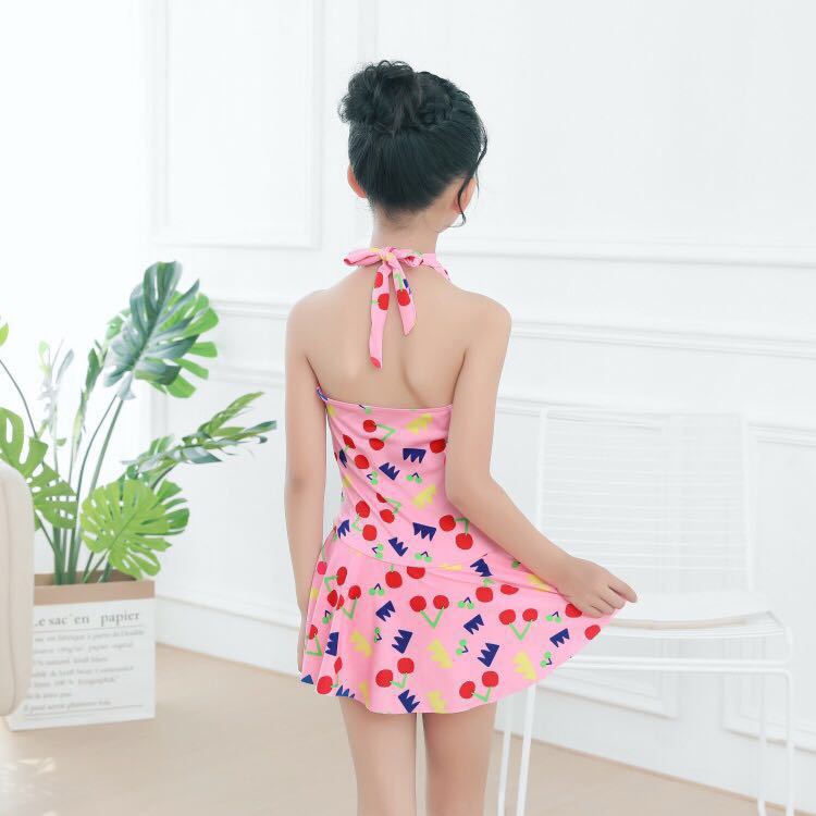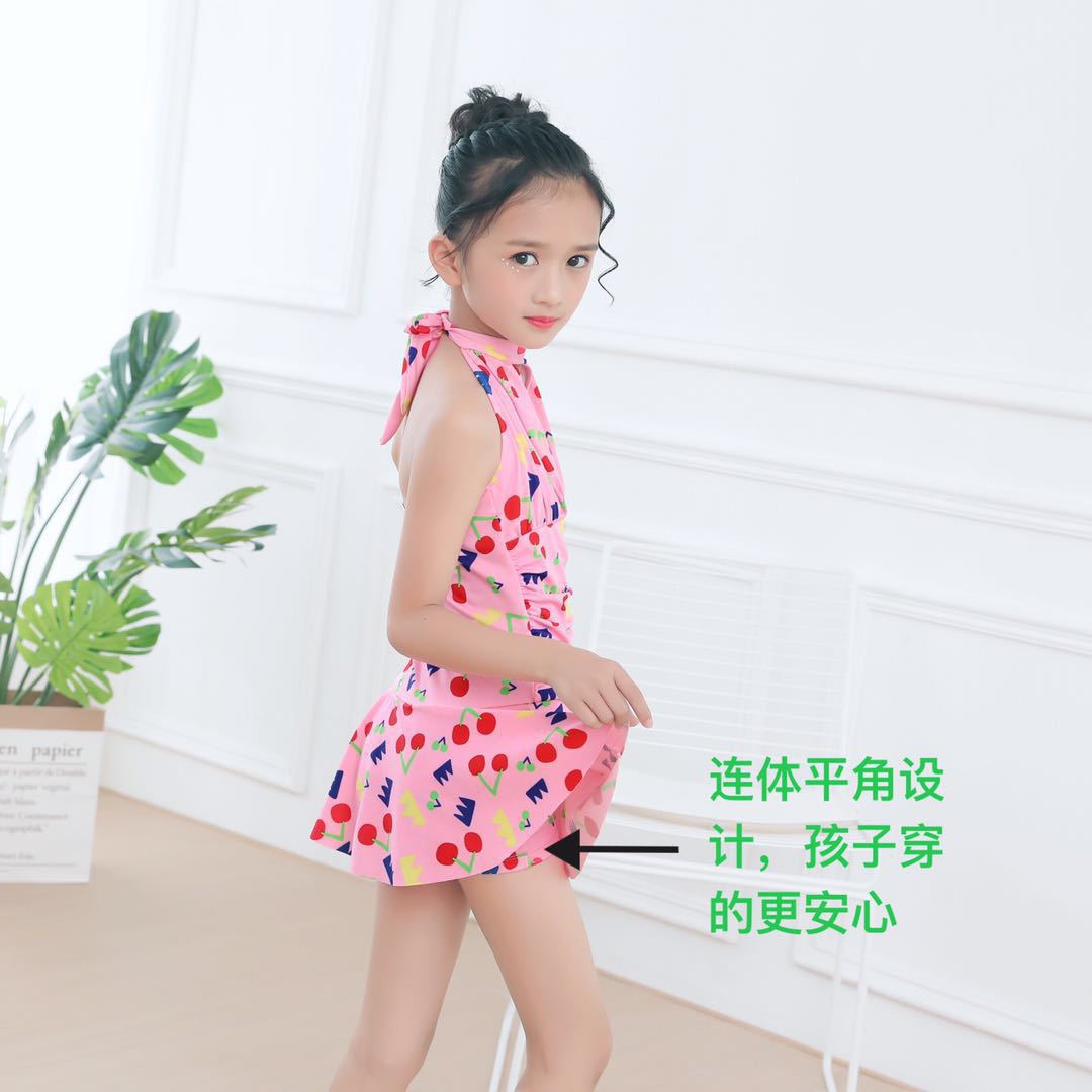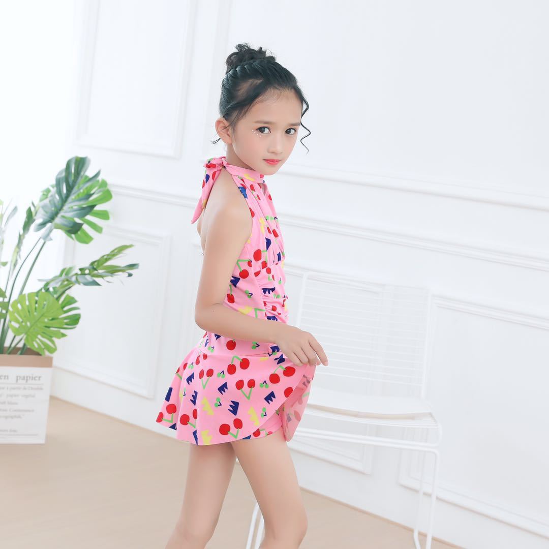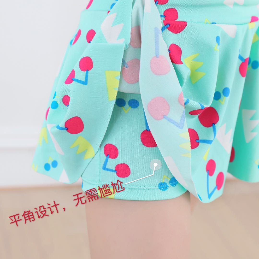 新款夏季儿童裙式泳衣学生个性防走光平角裤樱桃印花褶皱设计泳装