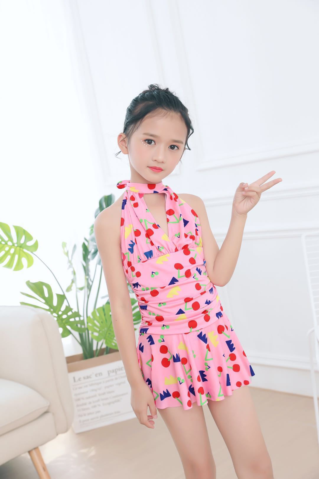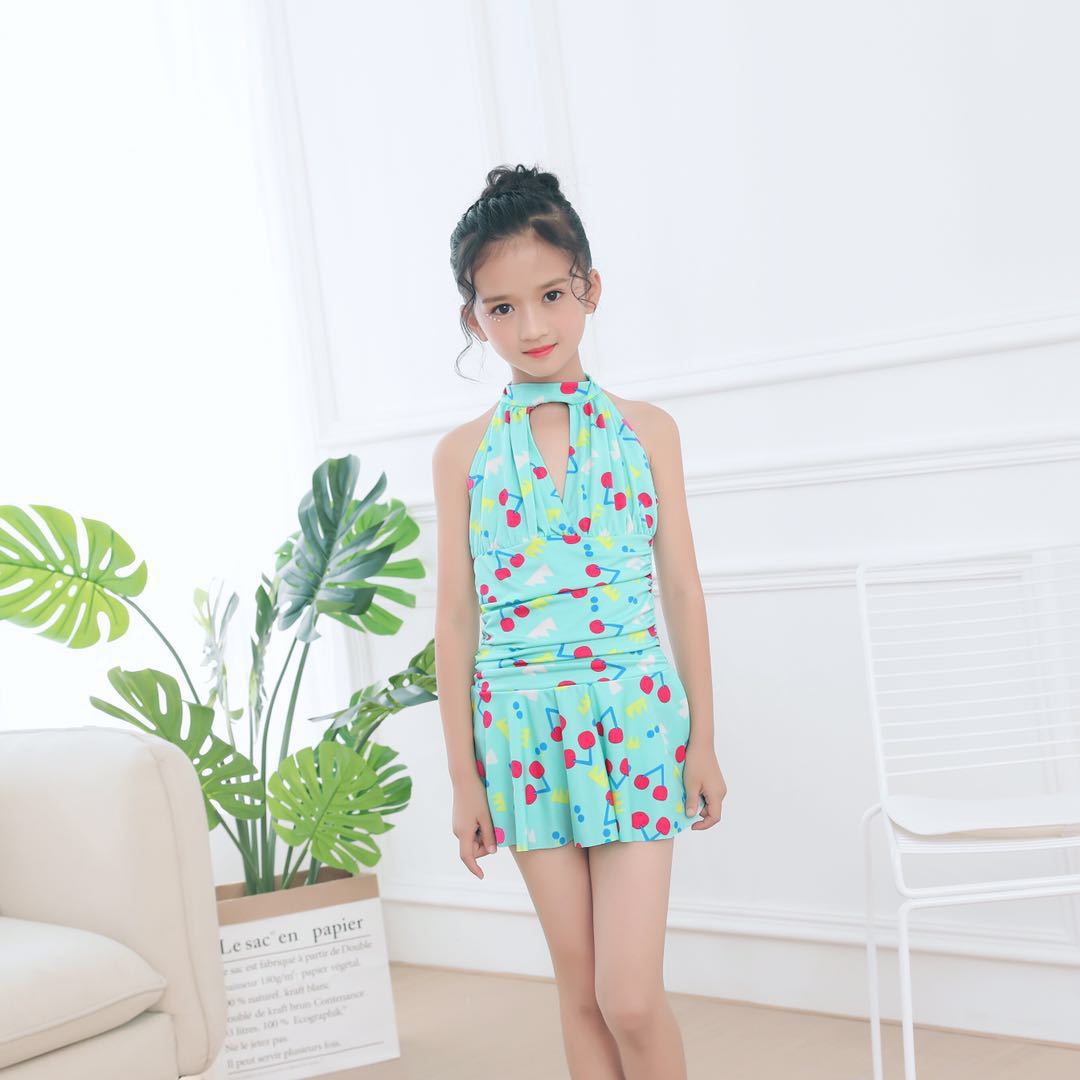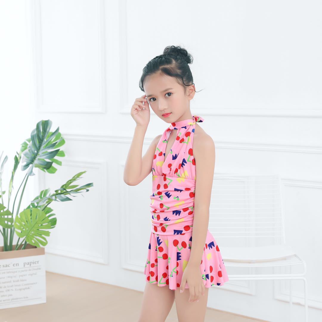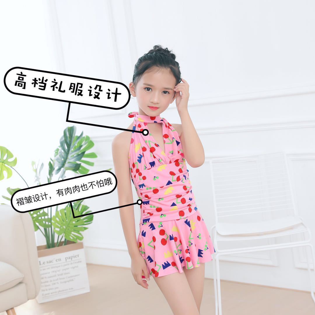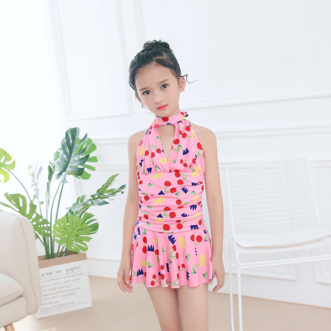 新款夏季儿童裙式泳衣学生个性防走光平角裤樱桃印花褶皱设计泳装