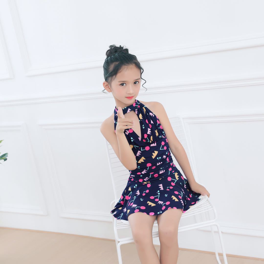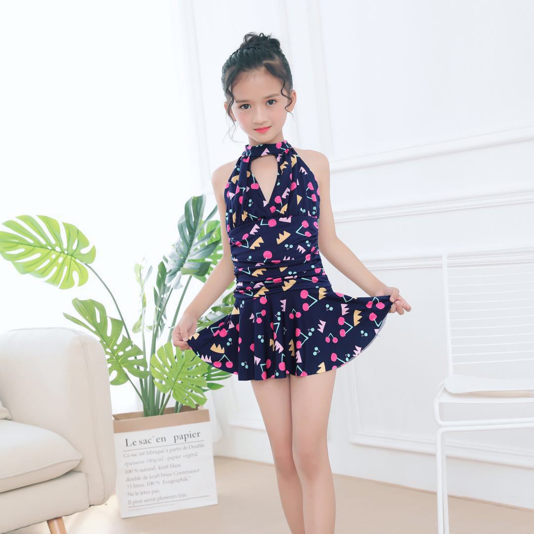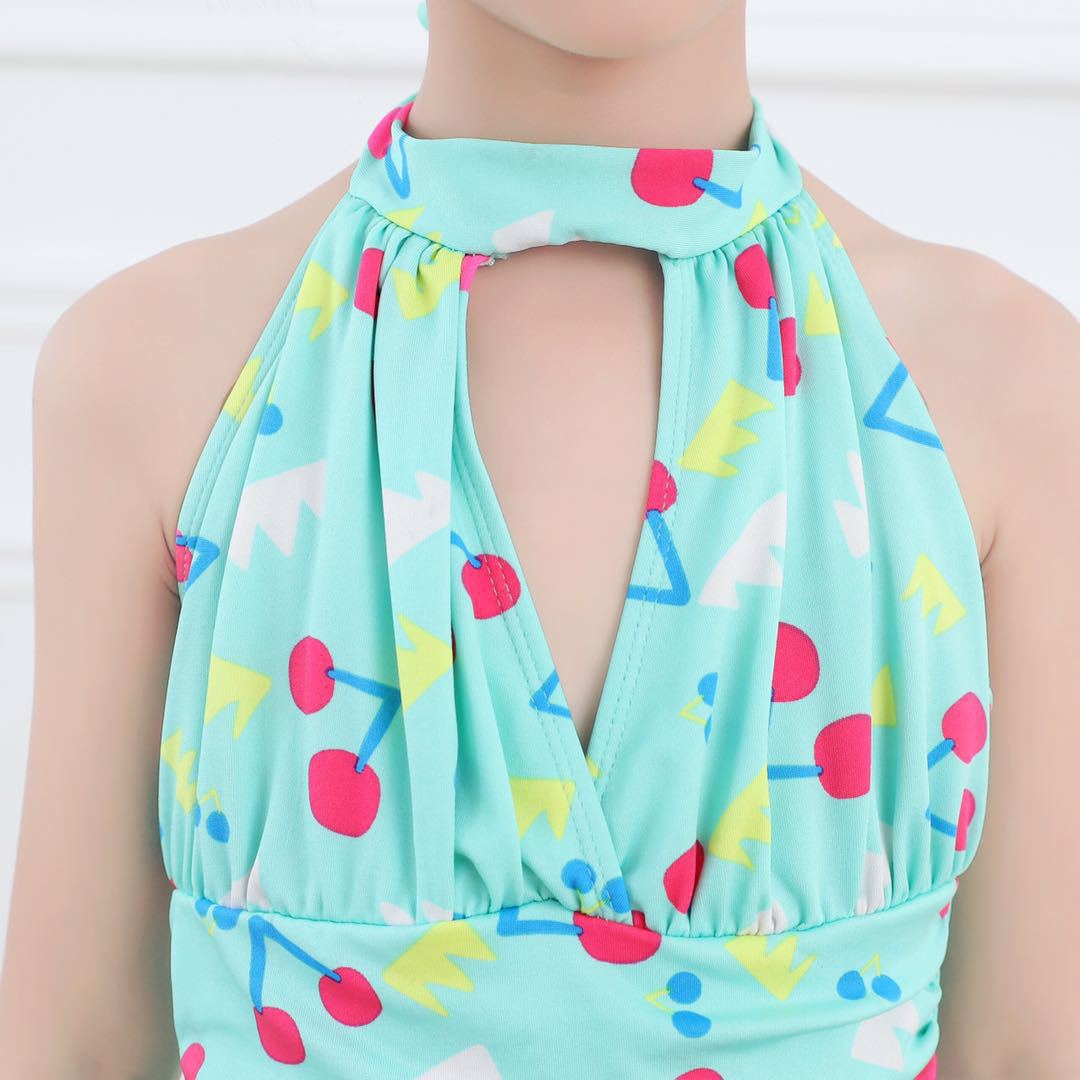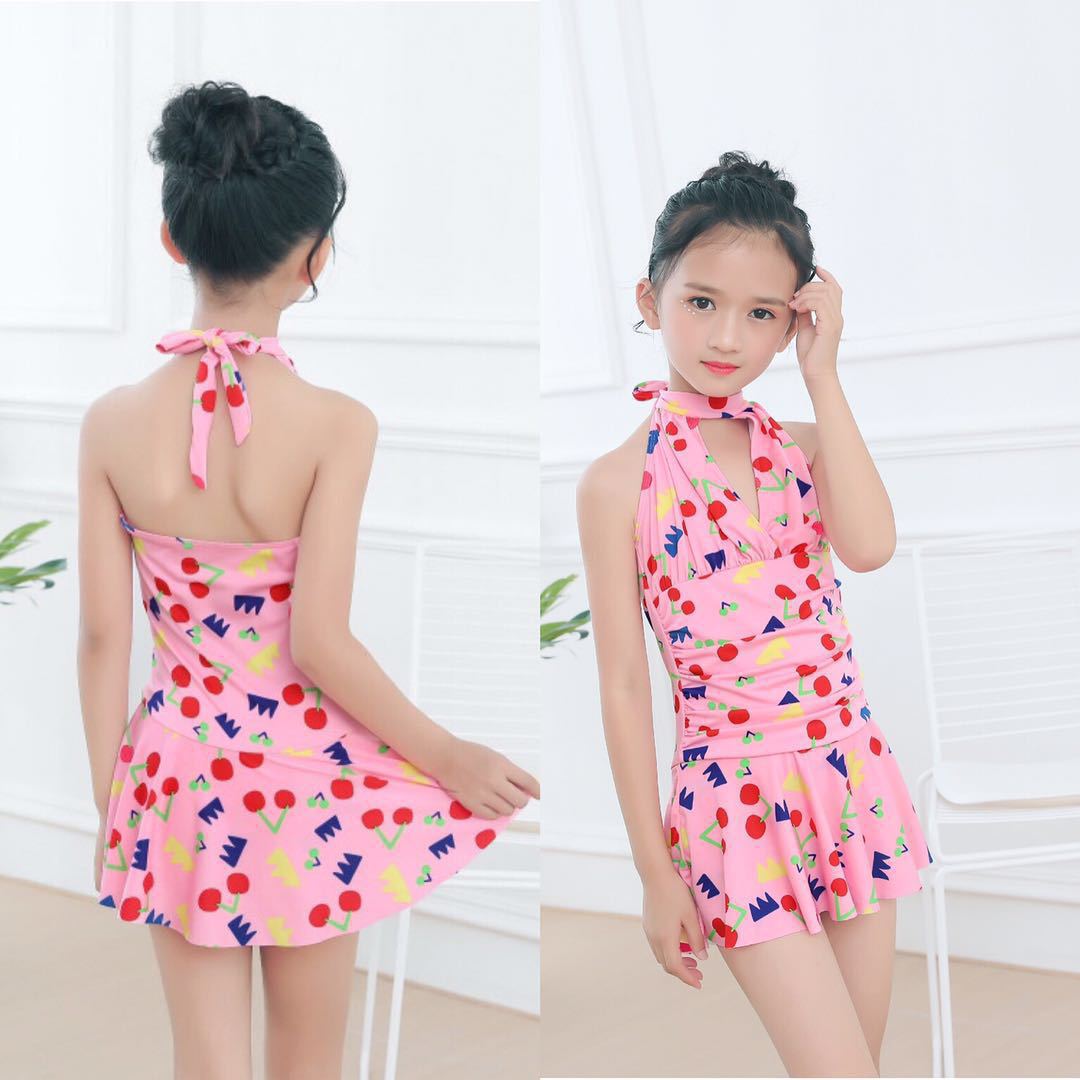 新款夏季儿童裙式泳衣学生个性防走光平角裤樱桃印花褶皱设计泳装