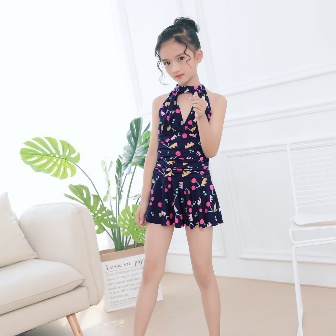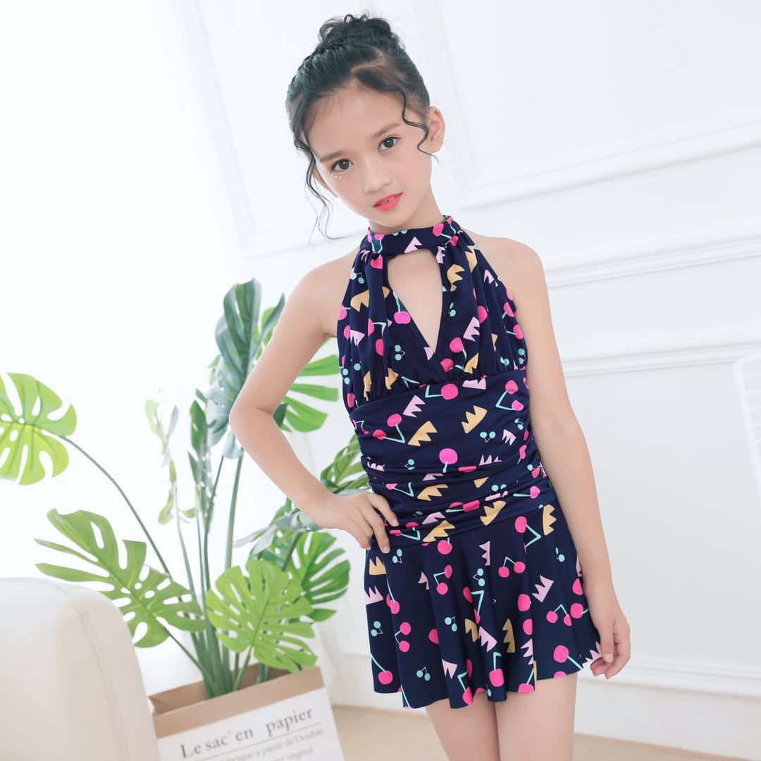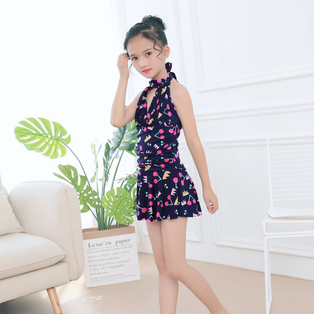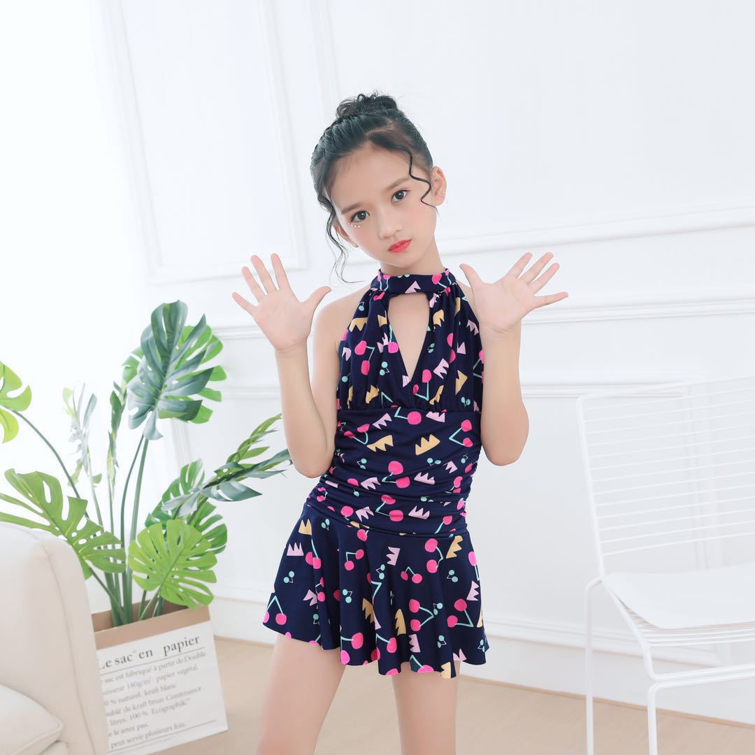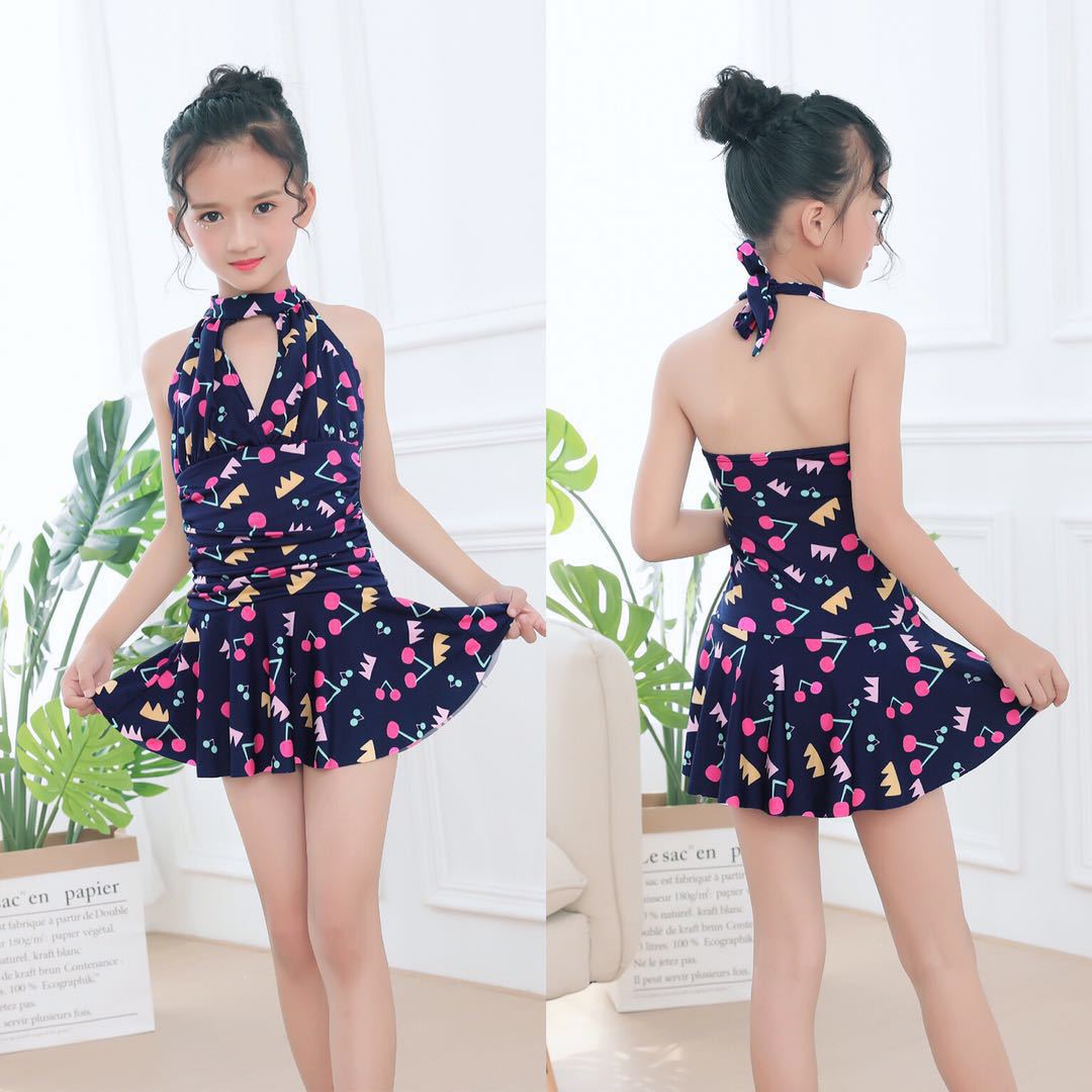 新款夏季儿童裙式泳衣学生个性防走光平角裤樱桃印花褶皱设计泳装