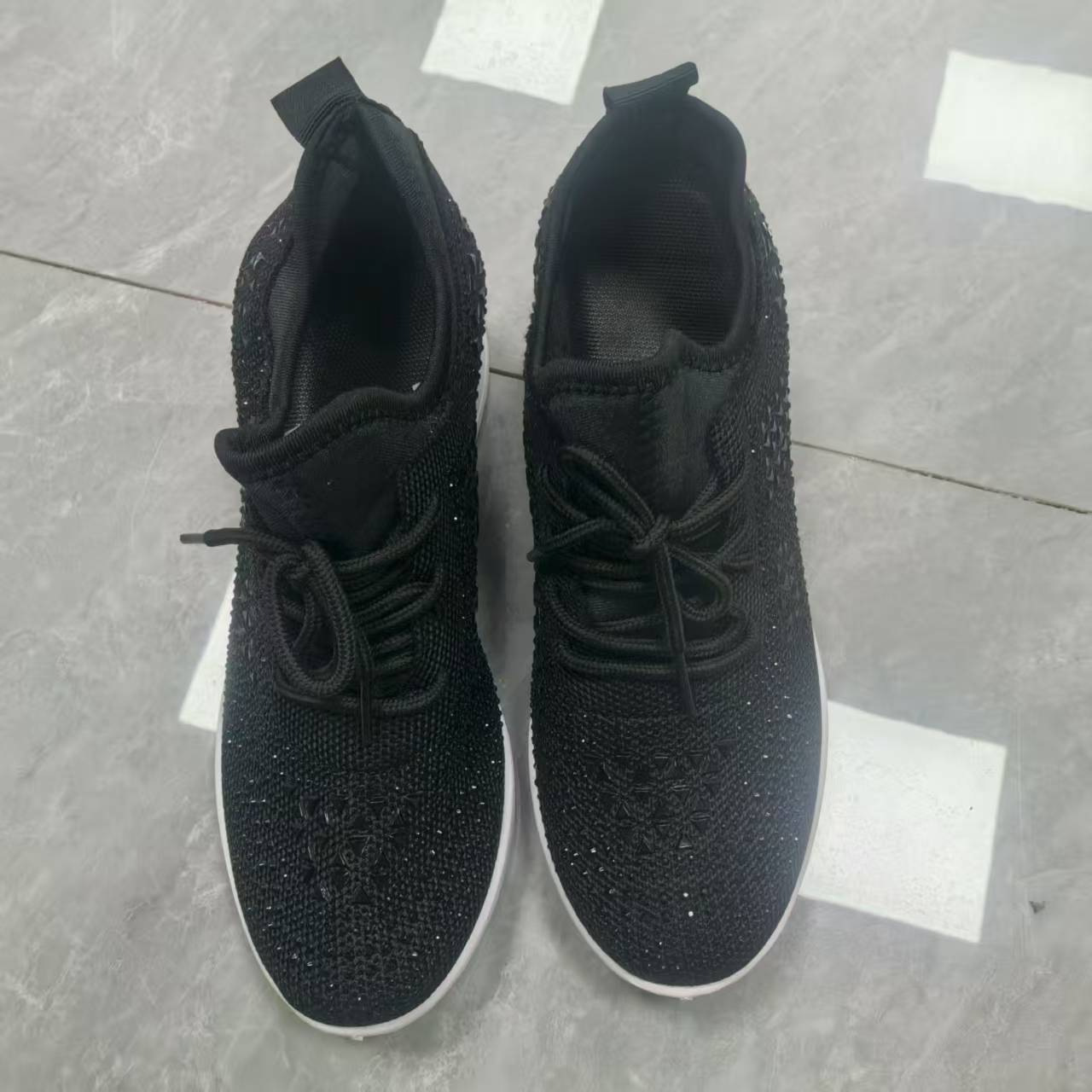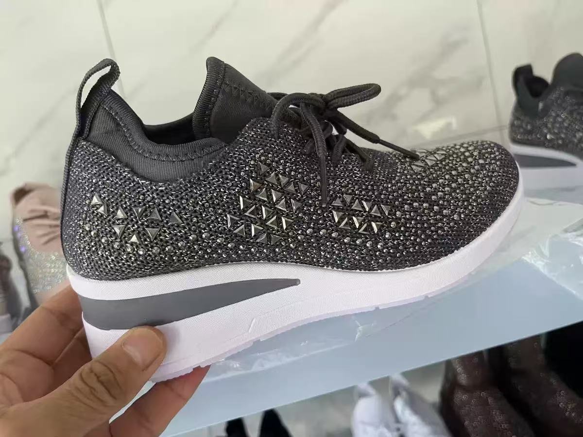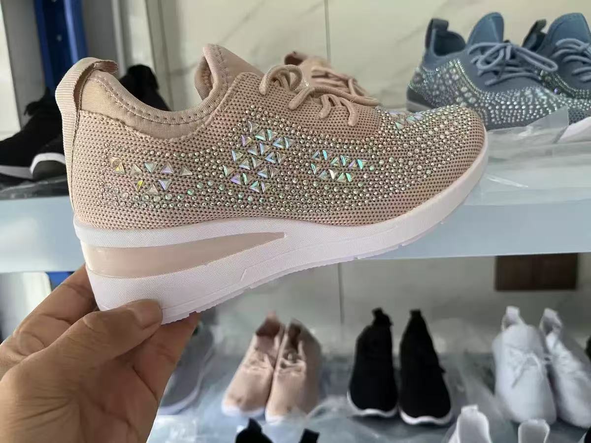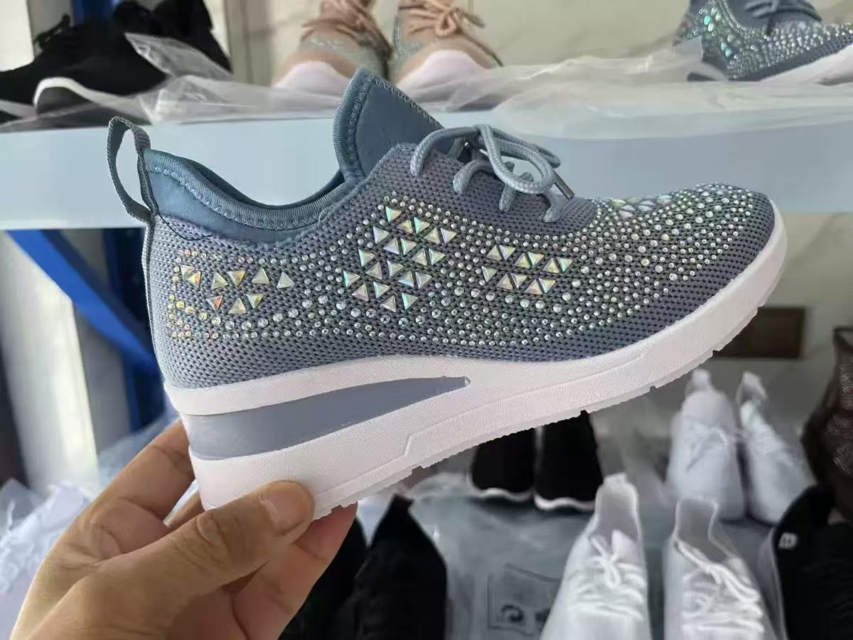 跨境水钻系带女休闲鞋低帮运动时尚风坡跟系带飞织女士运动单鞋