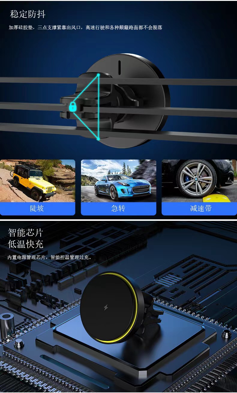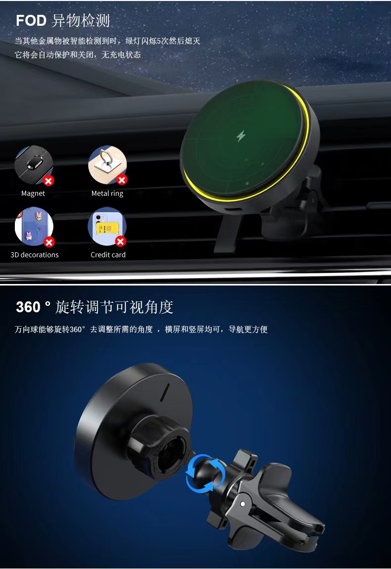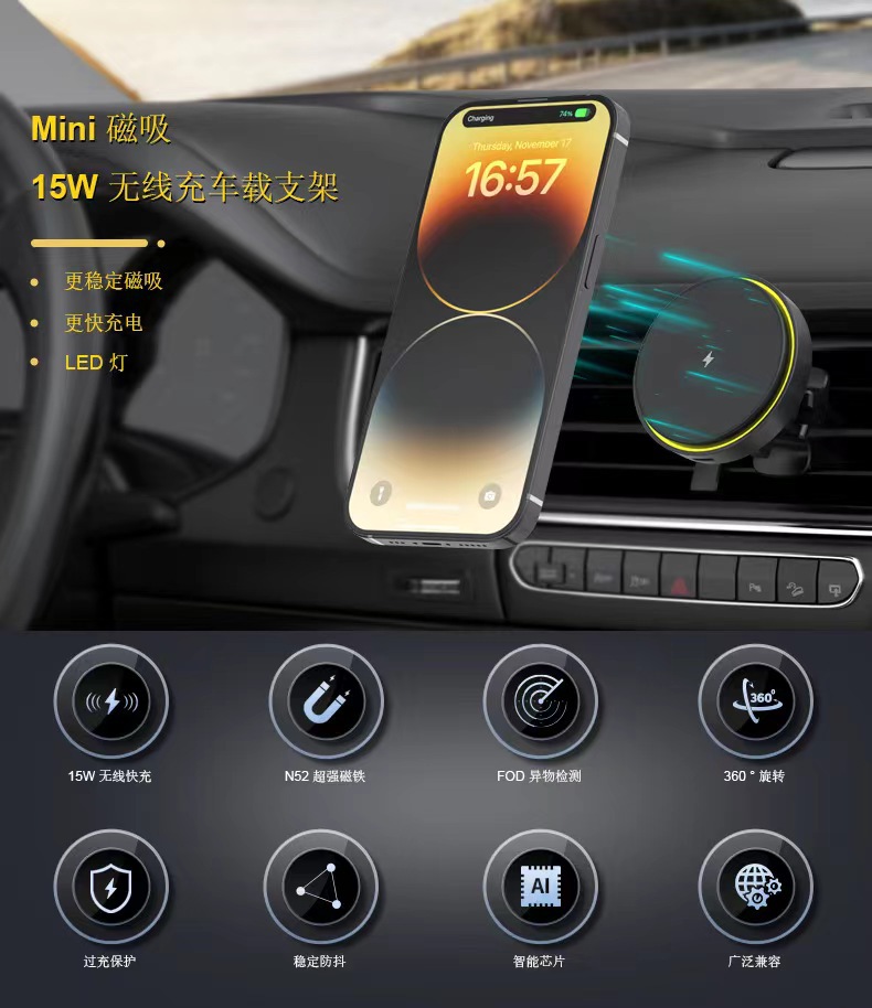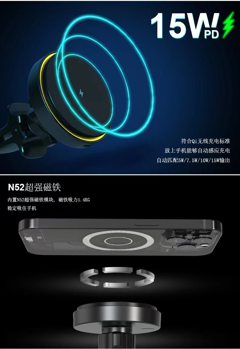 批发双色注塑柔光氛围灯15W超级快充磁吸无线充车载手机支架 跨境