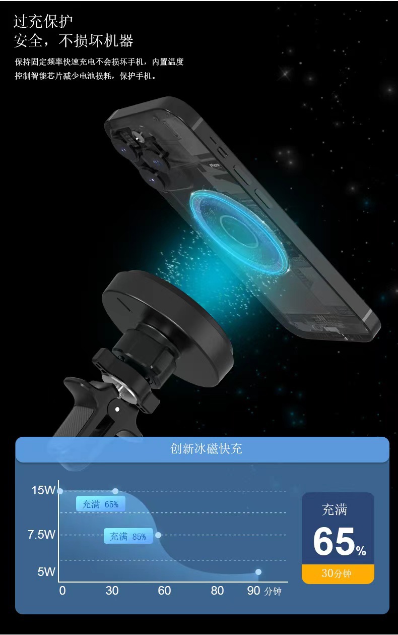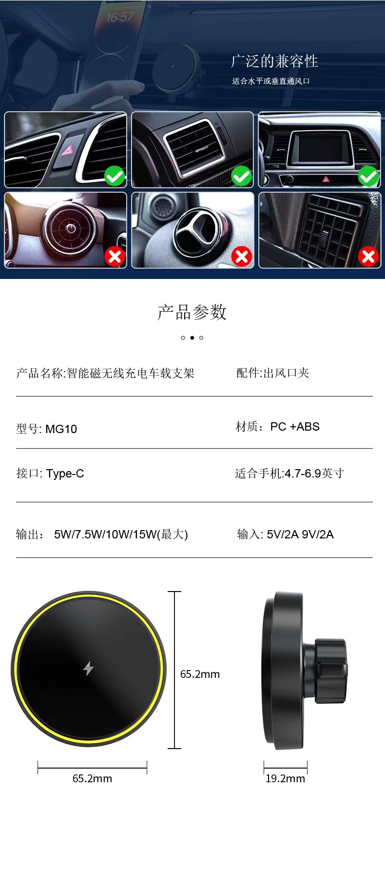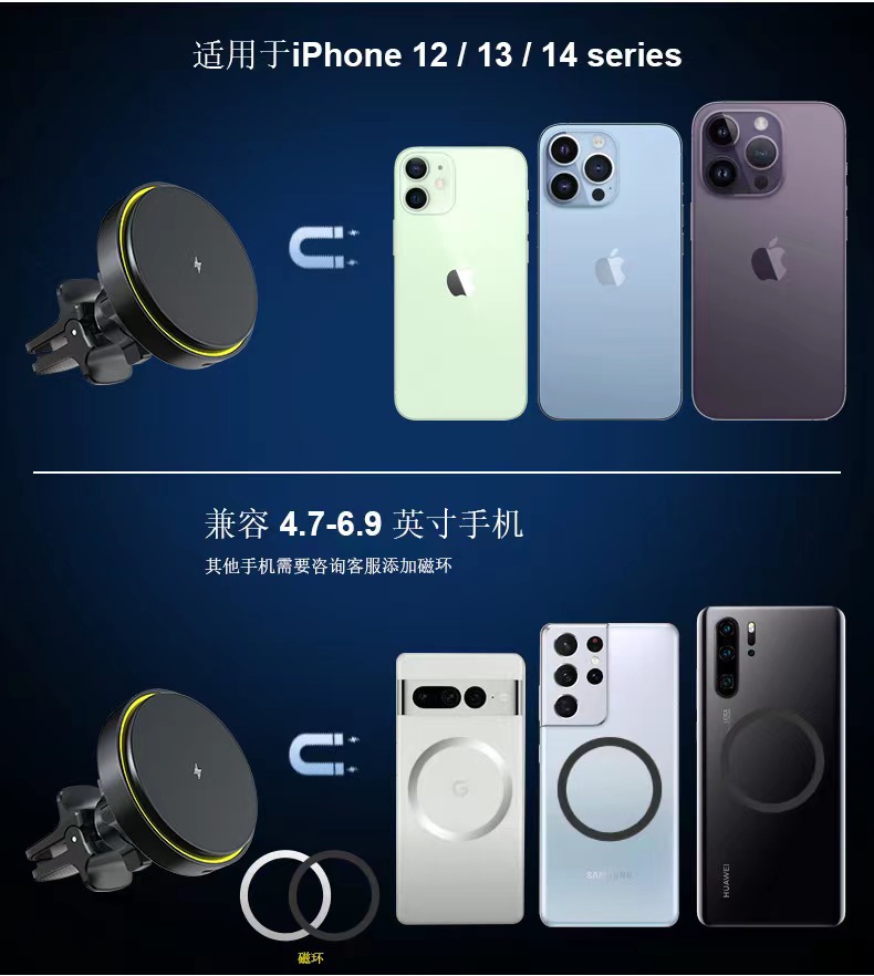 批发双色注塑柔光氛围灯15W超级快充磁吸无线充车载手机支架 跨境