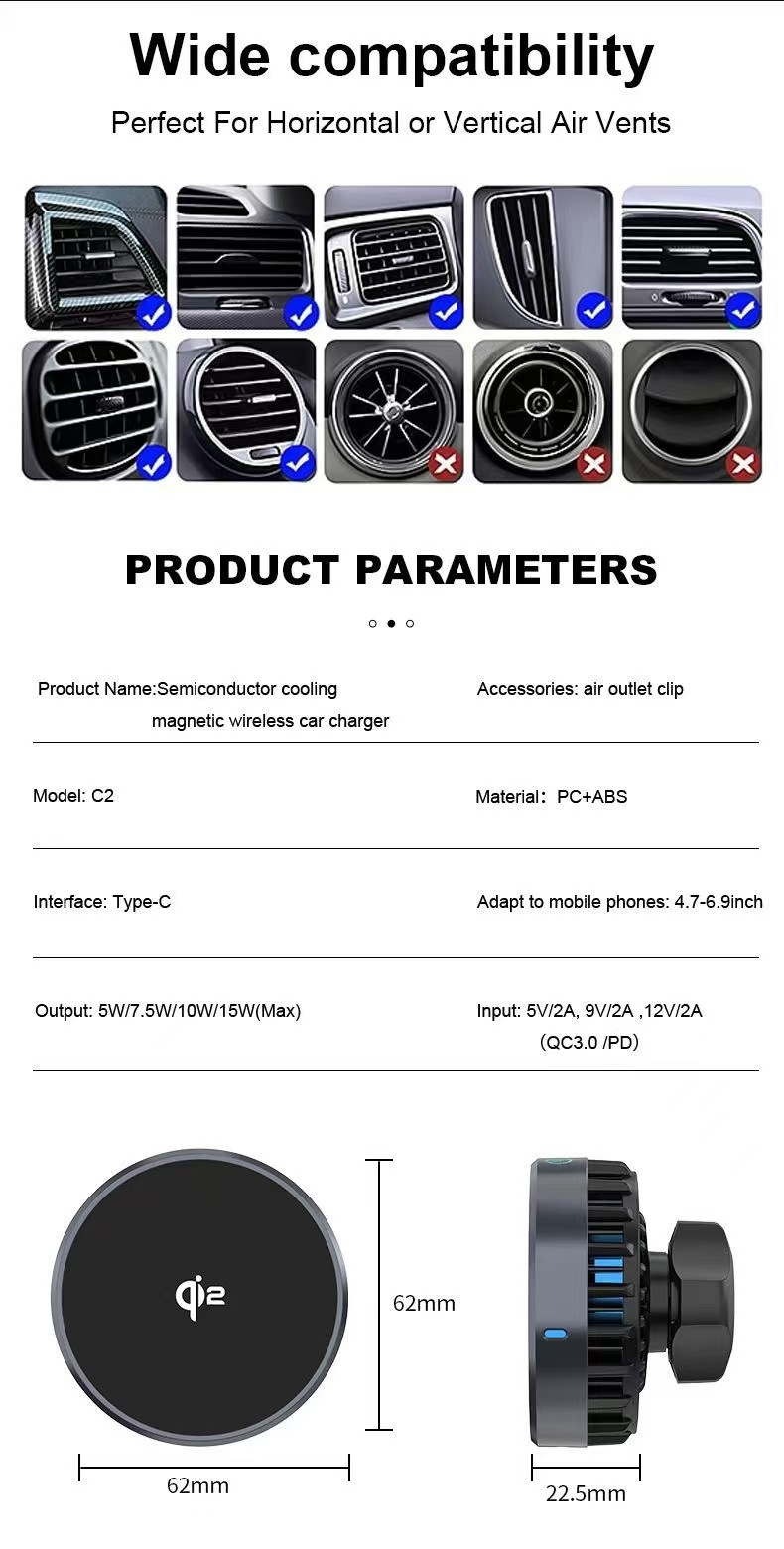 产品卖点:小巧、半导体制冷+镜片、大磁吸力、呼吸灯圈、无线快充。
