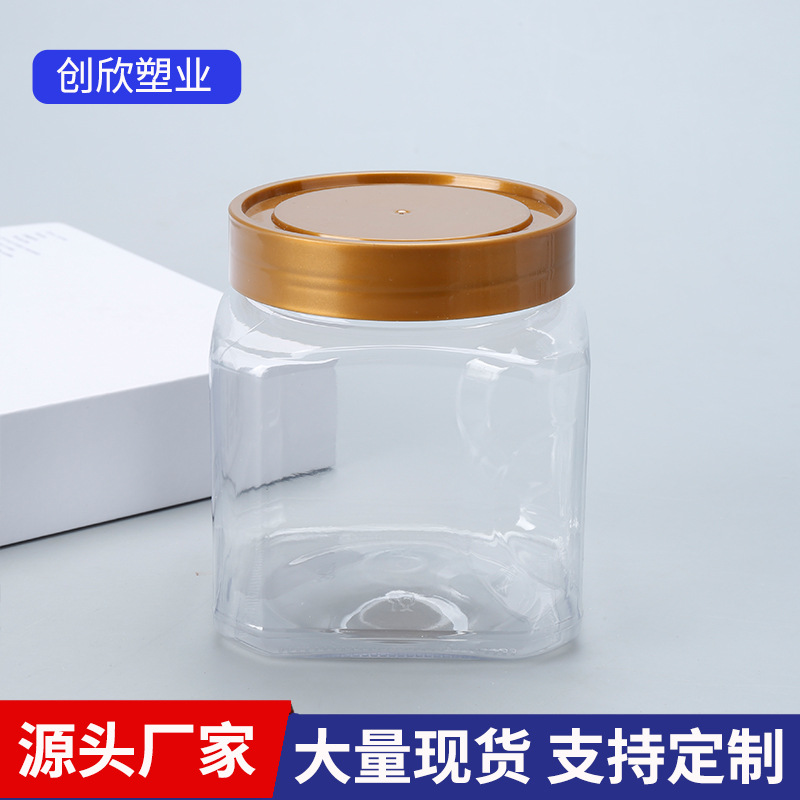 坚果包装罐现货680ml干果零食密封瓶子手抓空瓶金色凹槽盖pet方瓶