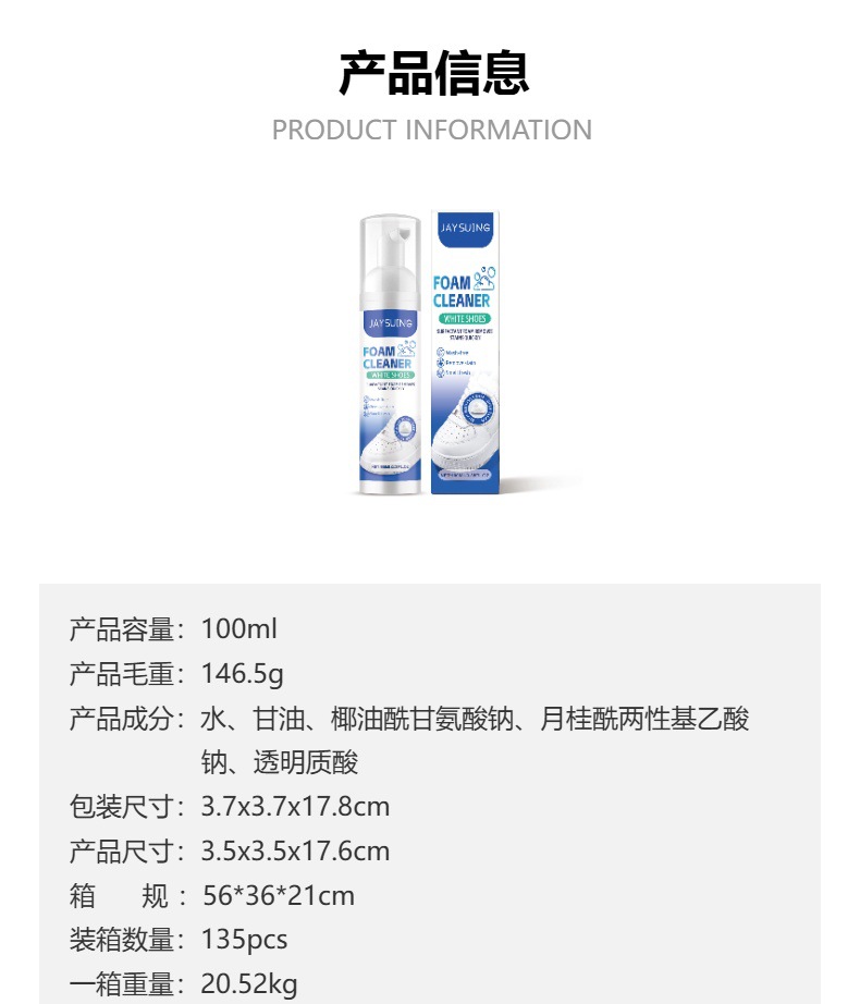 JAYSUING 小白鞋泡沫清洁剂 运动鞋去污鞋面洁净免水洗亮白清洁剂