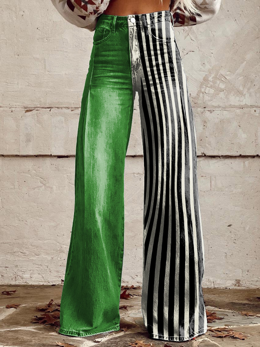 2024年薄款拼接图案数码印花女士喇叭裤新款热销防牛仔阔腿女长裤