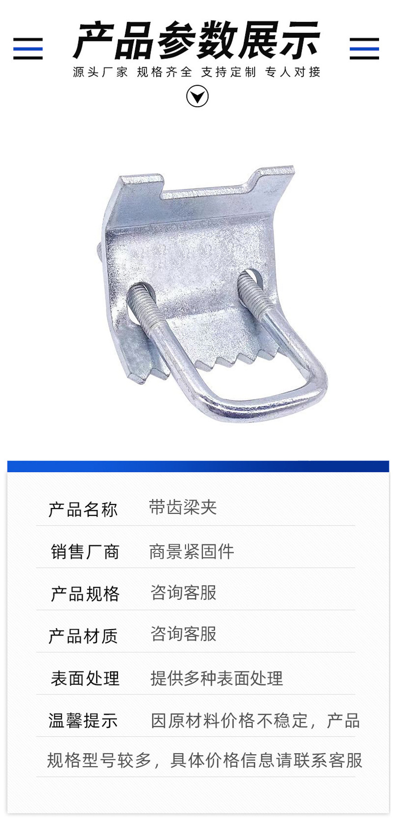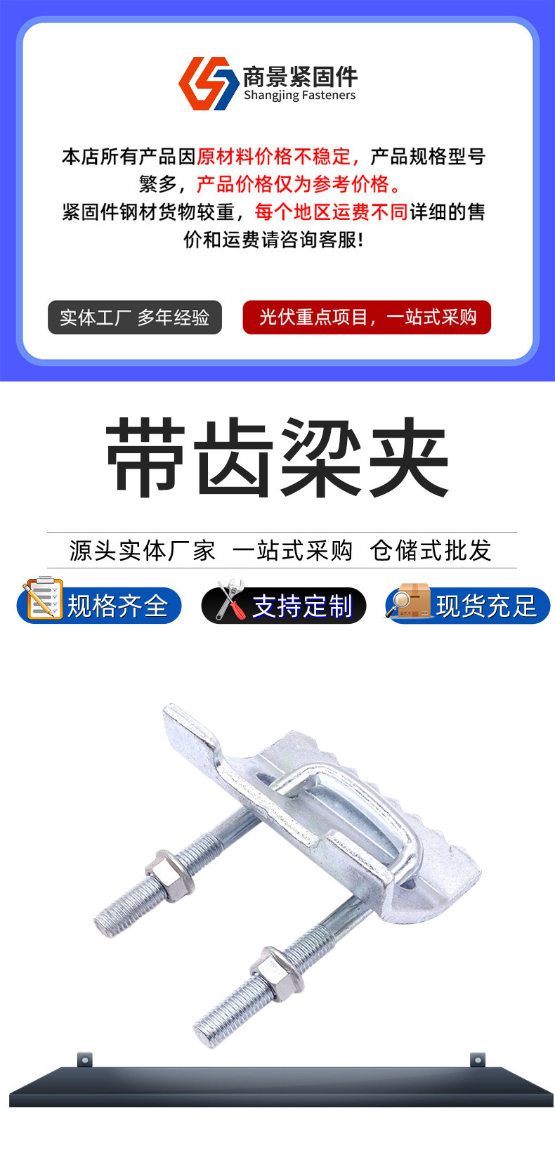 带齿钢梁U型带齿压板抗震支架配件钢结构太阳能光伏工具支架压板