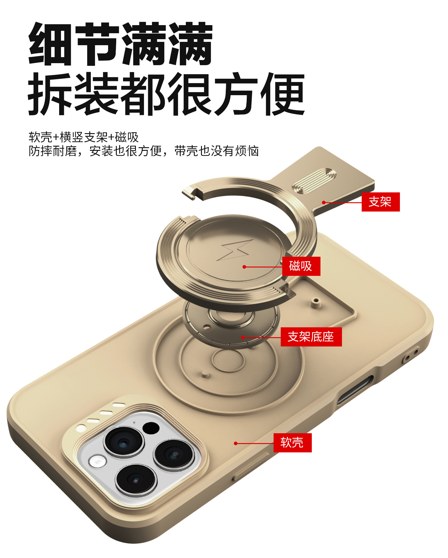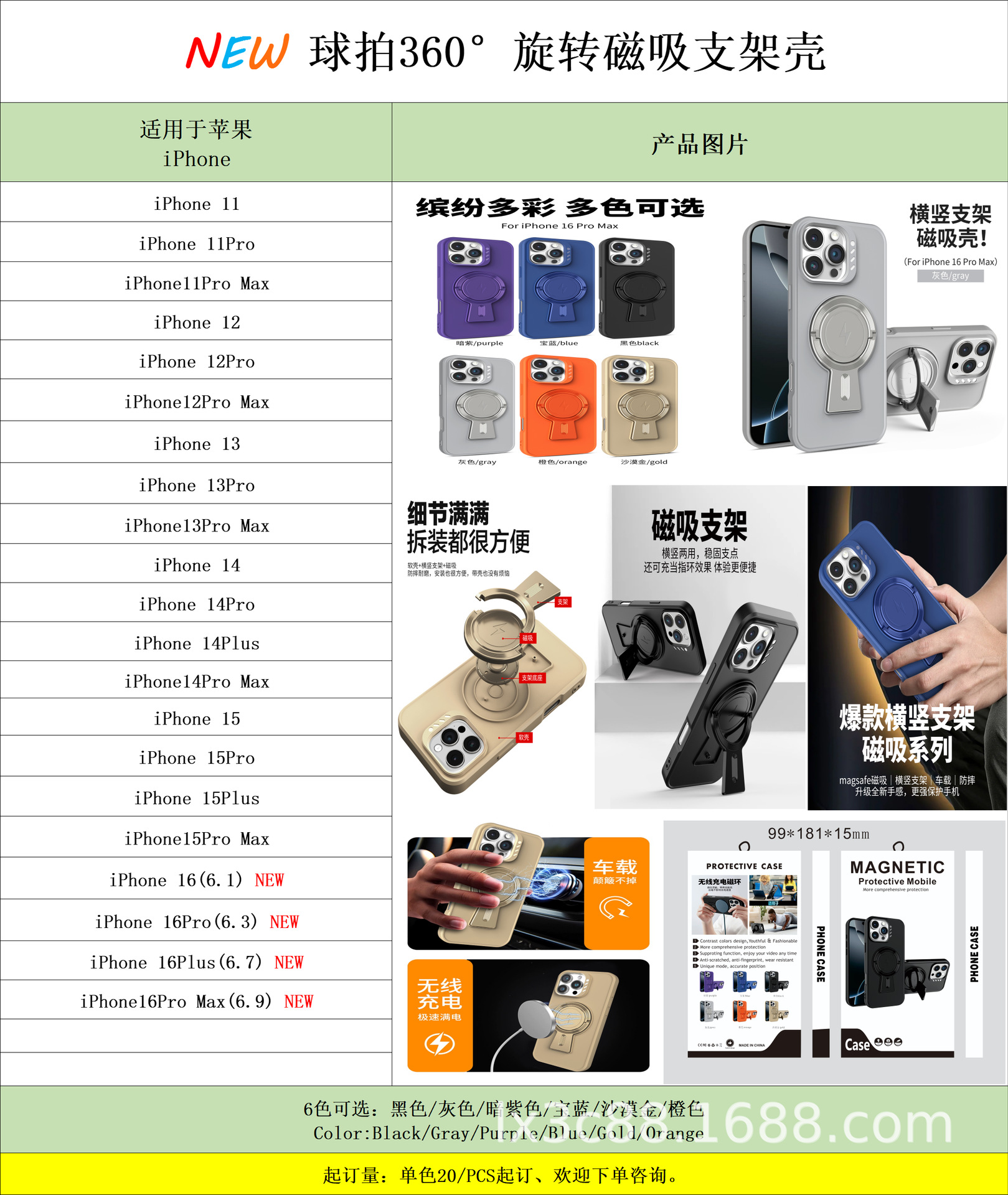 2024新款《球拍360旋转磁吸支架壳》手机壳TPU软壳全包、磨砂肌肤手感防摔,防滑、金属油漆PC+360旋转支架设计、拉起实用、收起干脆、爆款横坚支架磁吸系列、轻轻松松解放双手、镜头部分略微加高保护、还支持各种磁吸配件、牢牢吸附、怎么甩都不掉、炫彩六色选择、单色20起订,默认袋装,如需要包装盒出货请联系客服,欢迎下单。