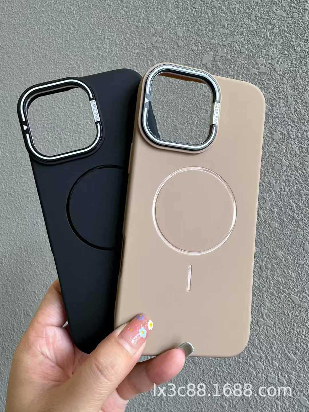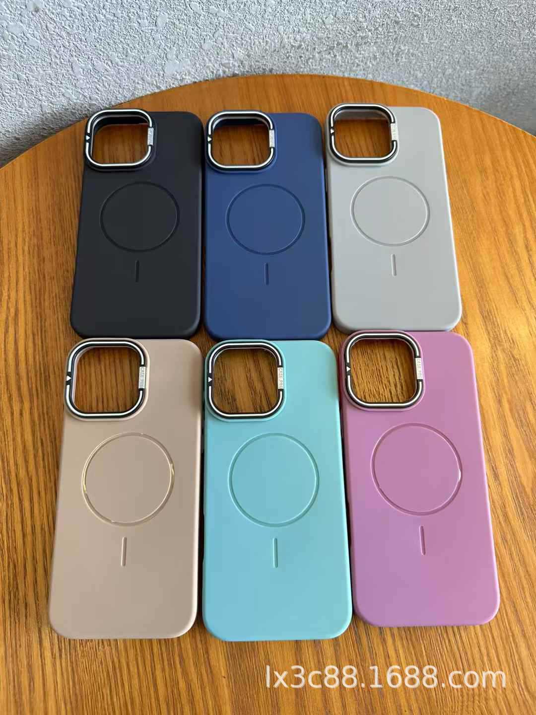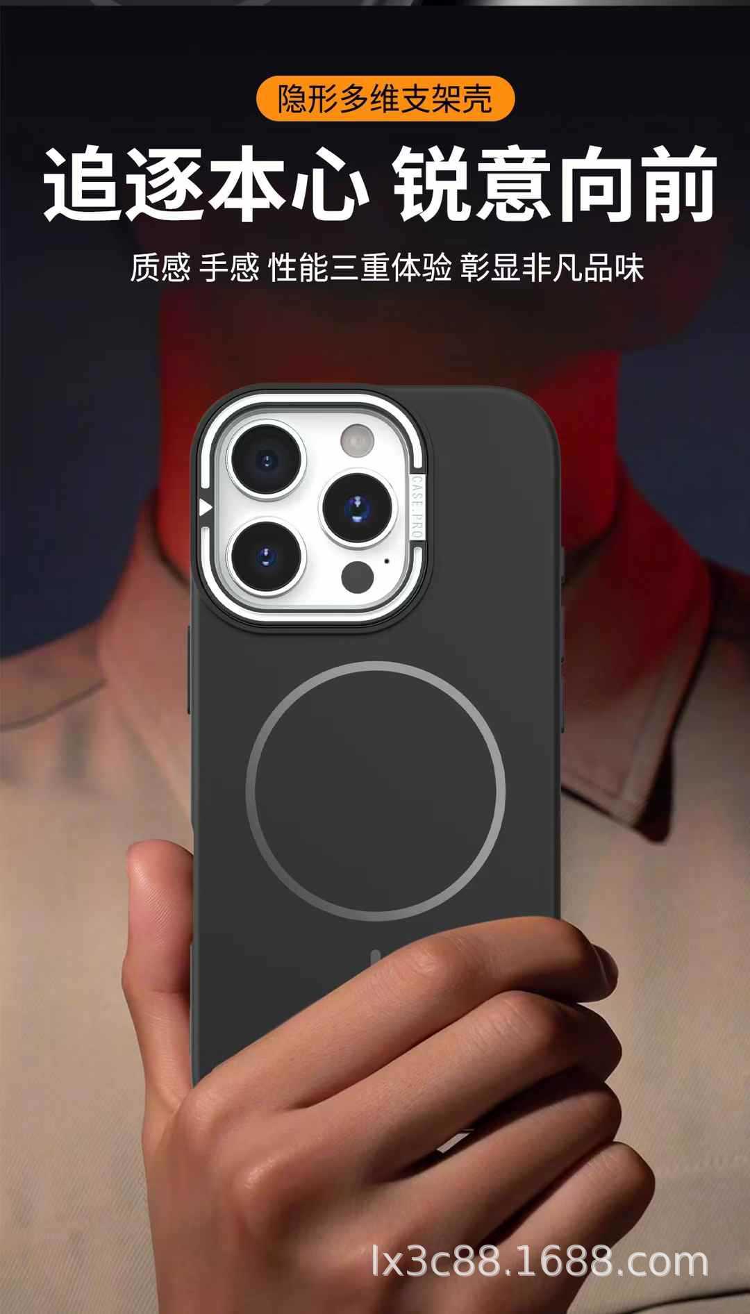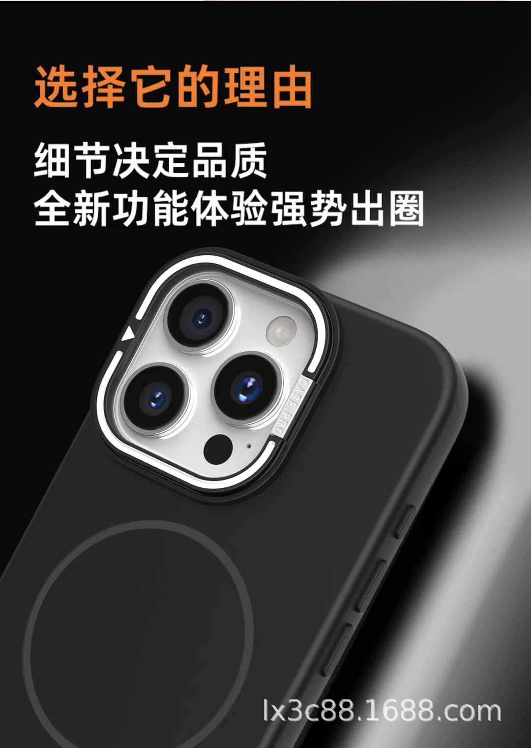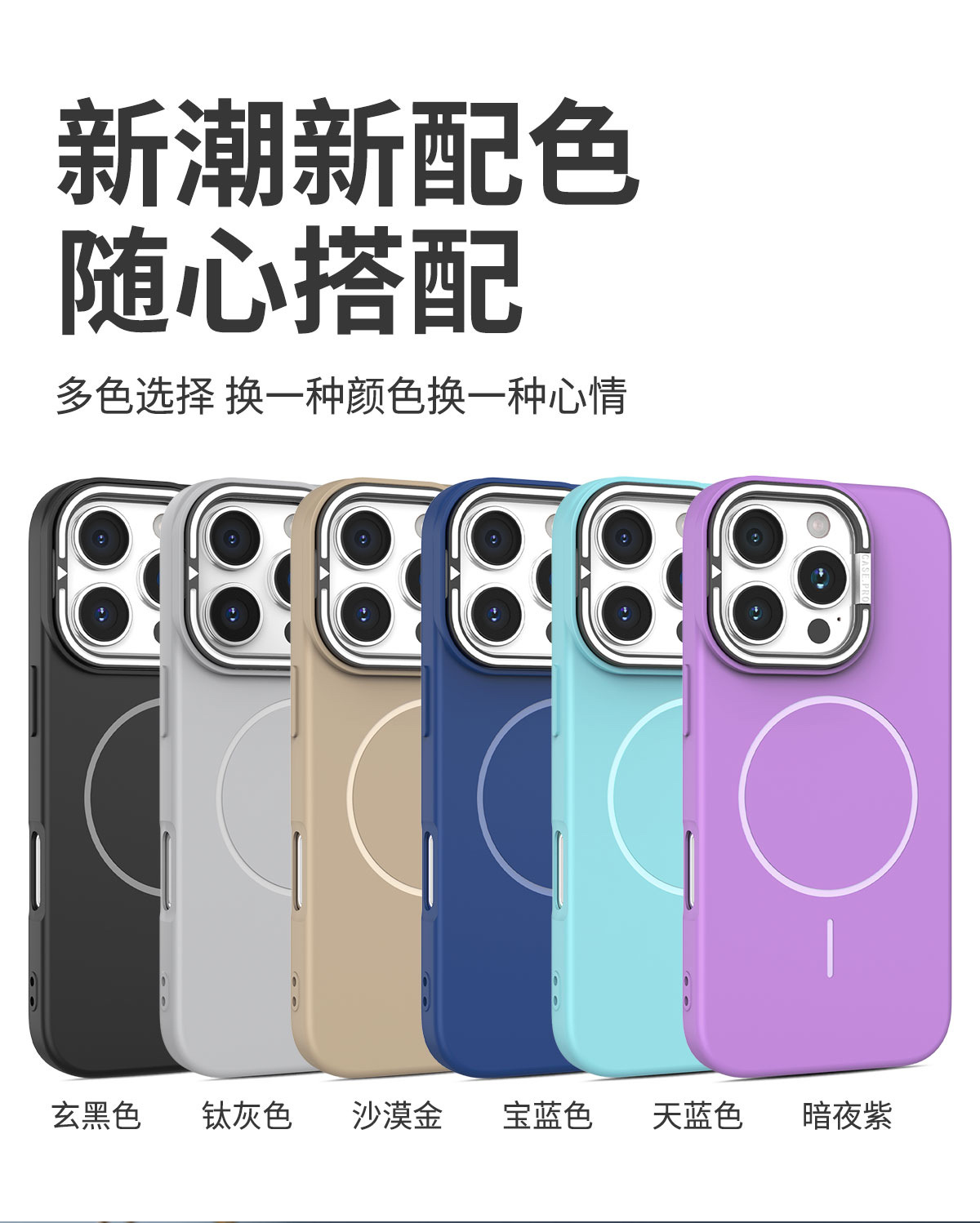 NEW 2025新款 镜头支架细环磁吸壳,全TPU软材质,摄像头加高保护,隐藏式镜框支架,轻松易拉开触点自锁,细环磁吸设计吸力稳固充电稳定,细节方面边框没有合模线,四周一体全包正面齐平屏幕不漏边,纯色磨砂肌肤手感,细腻防滑防摔,支持Magsafe磁吸充电、6种颜色选择,单型号单色20PCS起订,下单请按10倍数下单,订单500PCS起订,默认袋装,如需要搭配纸质包装盒请联系客服.