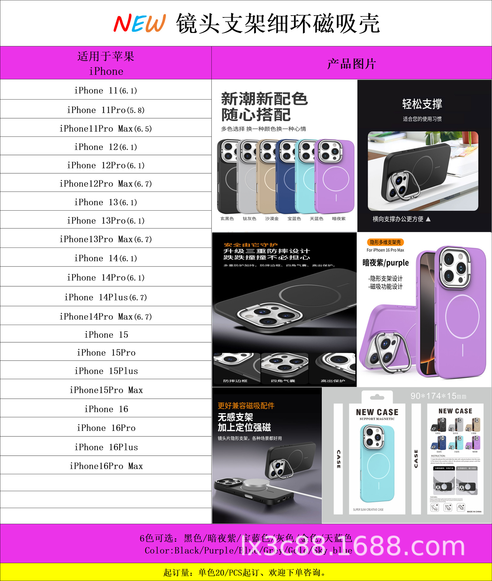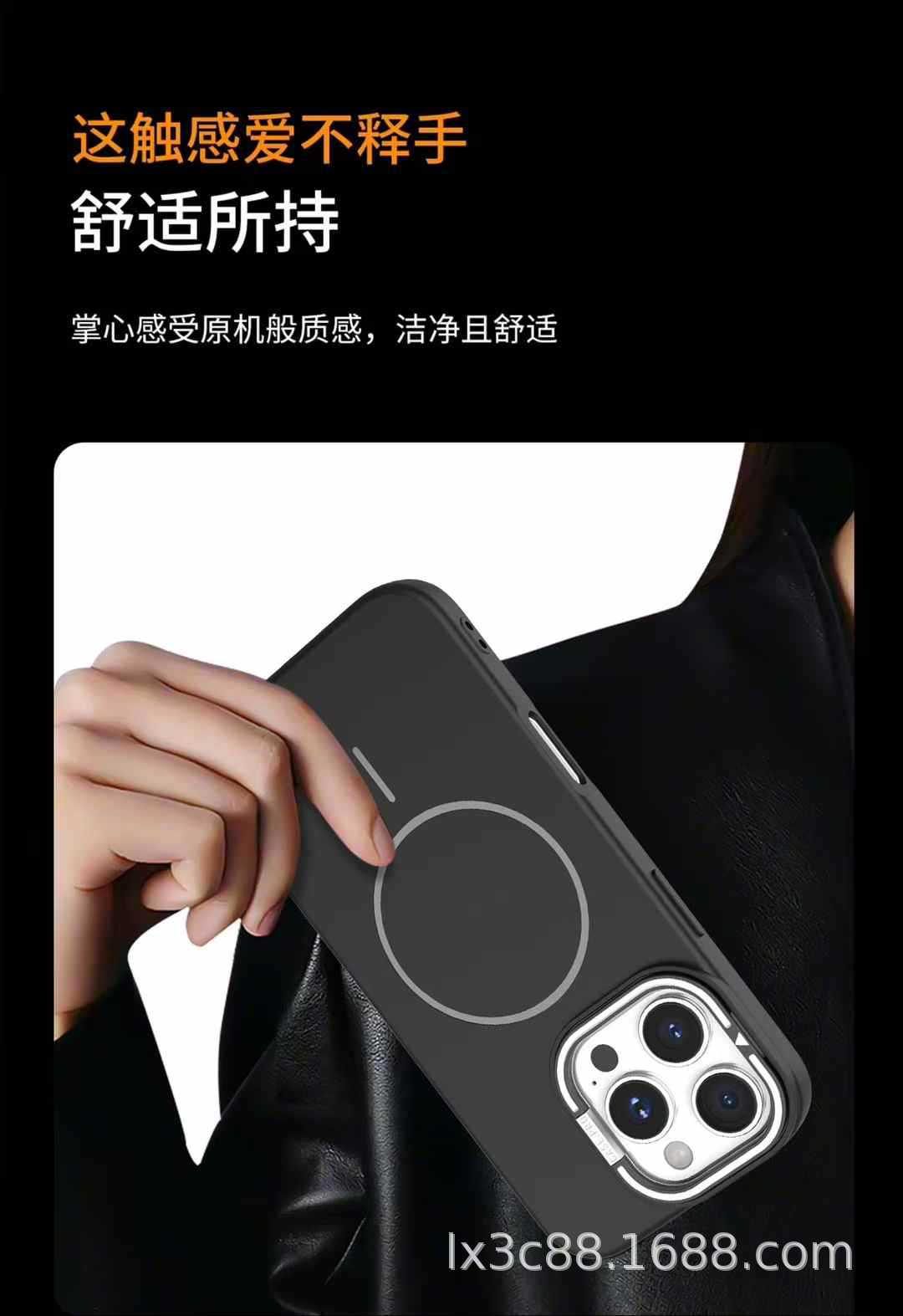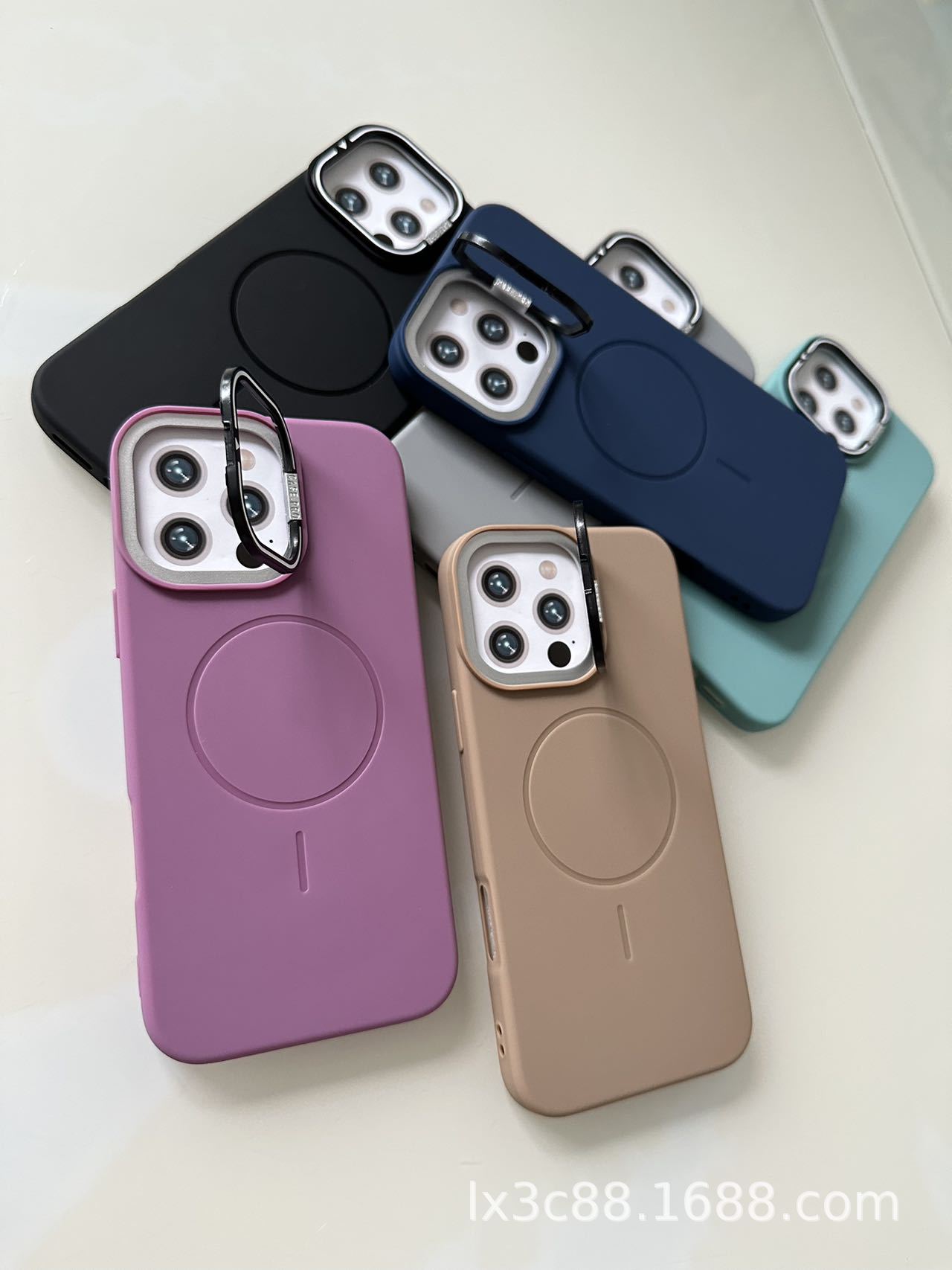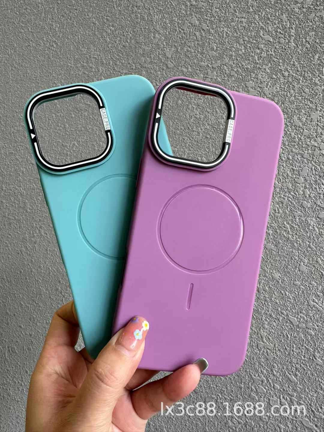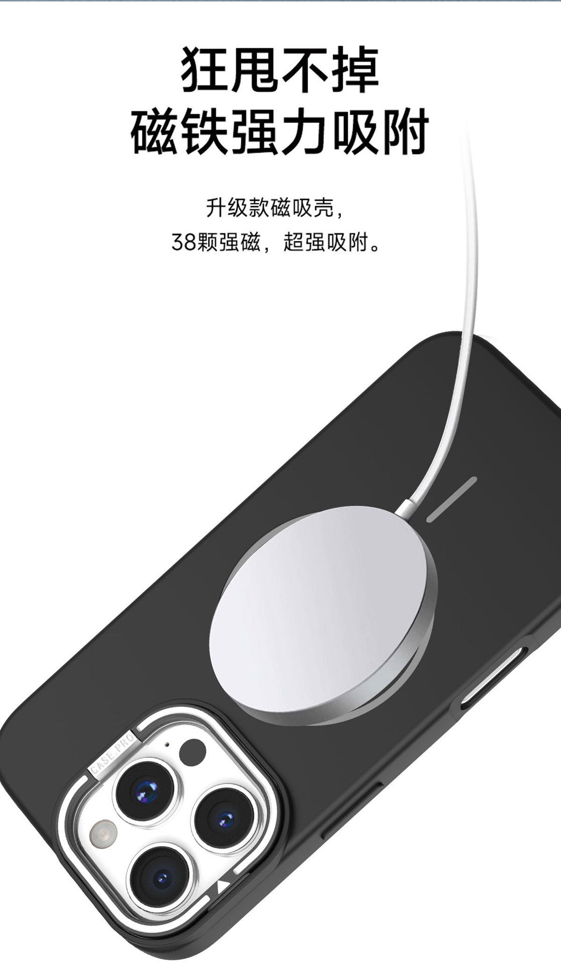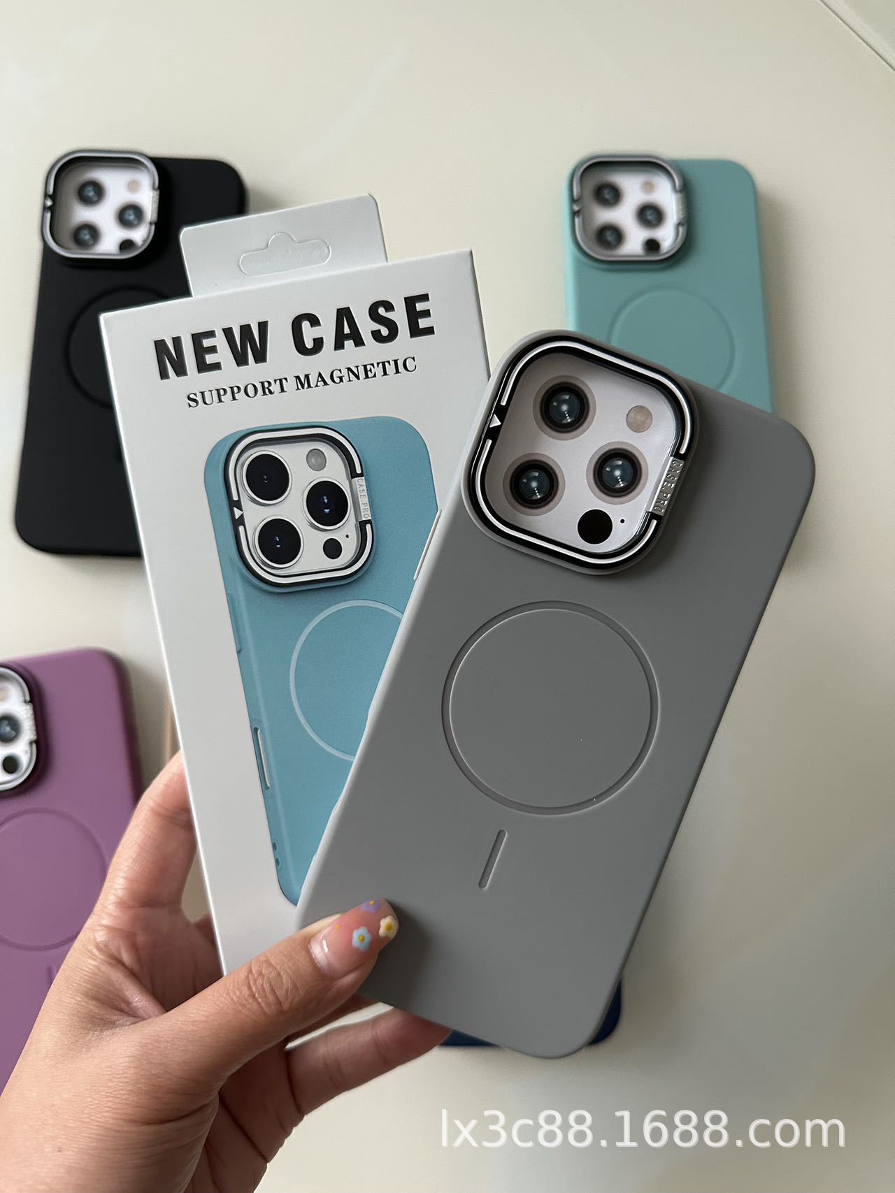 NEW 2025新款 镜头支架细环磁吸壳,全TPU软材质,摄像头加高保护,隐藏式镜框支架,轻松易拉开触点自锁,细环磁吸设计吸力稳固充电稳定,细节方面边框没有合模线,四周一体全包正面齐平屏幕不漏边,纯色磨砂肌肤手感,细腻防滑防摔,支持Magsafe磁吸充电、6种颜色选择,单型号单色20PCS起订,下单请按10倍数下单,订单500PCS起订,默认袋装,如需要搭配纸质包装盒请联系客服.