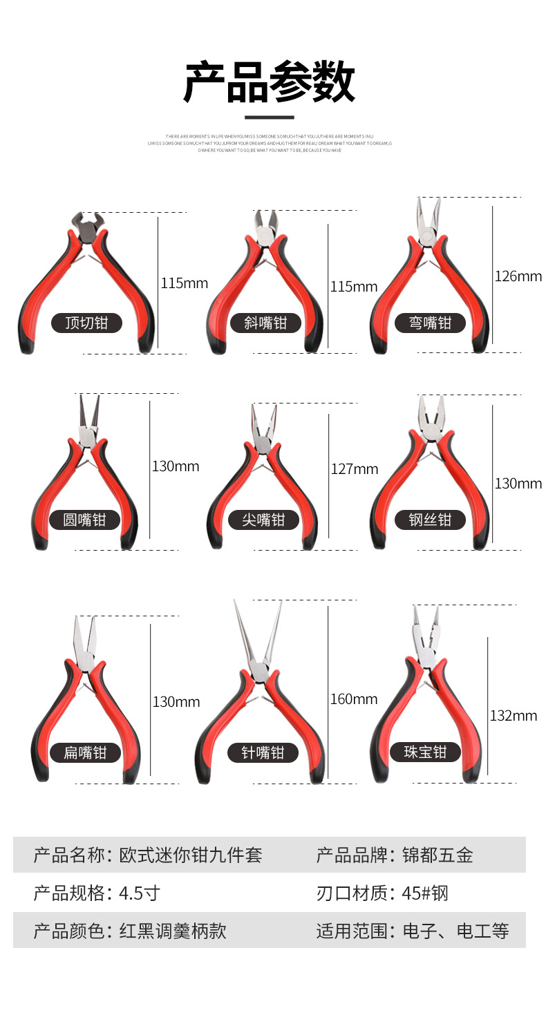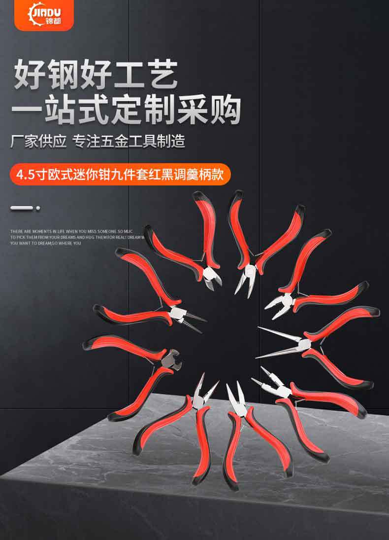 现货供应4.5寸欧式迷你钳九件套五金工具红黑调羹柄款批发厂家