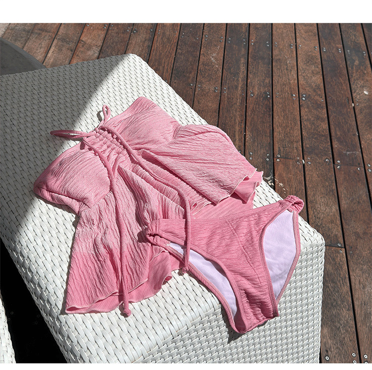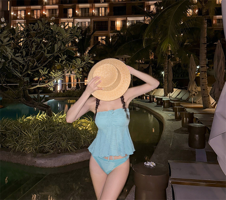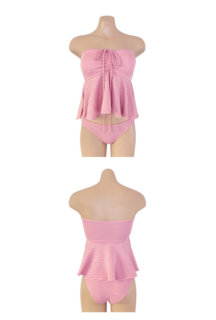 纯欲泳衣女可爱性感纯色抽绳挂脖抹胸保守分体比基尼条纹沙滩泳装