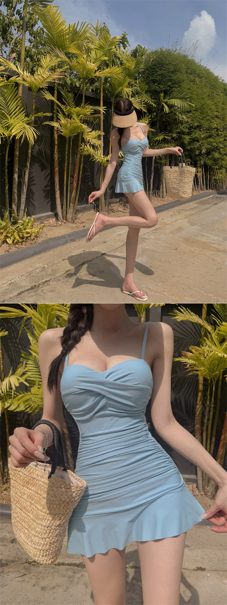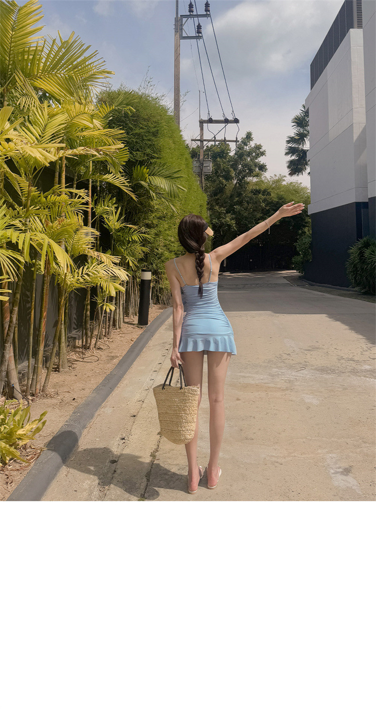 纯欲新款清纯吊带泳衣跨境保守短裙褶皱遮肉韩系可爱比基尼温泉女