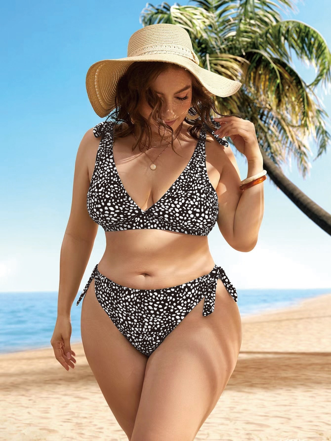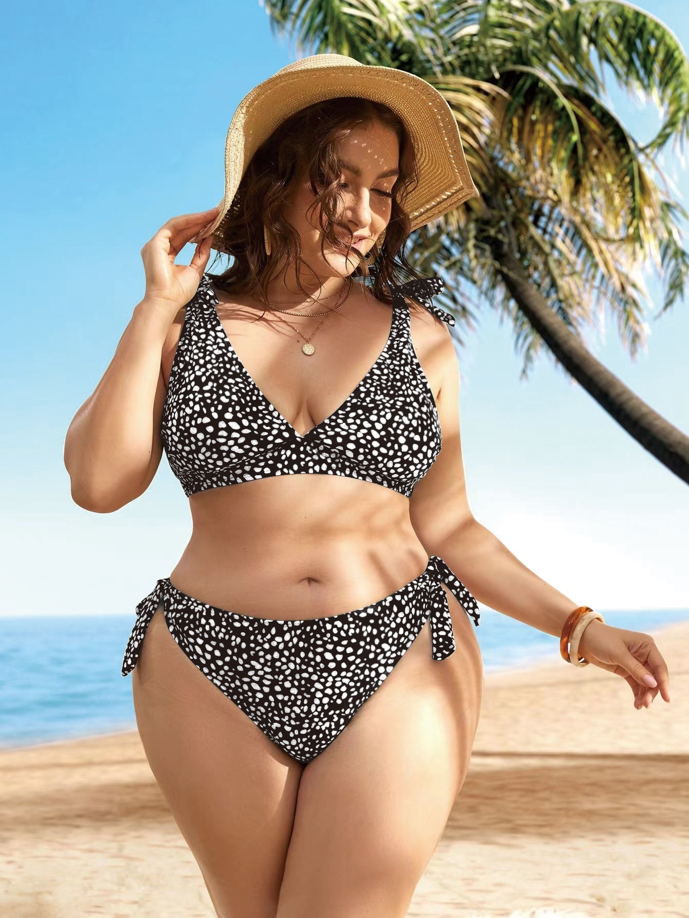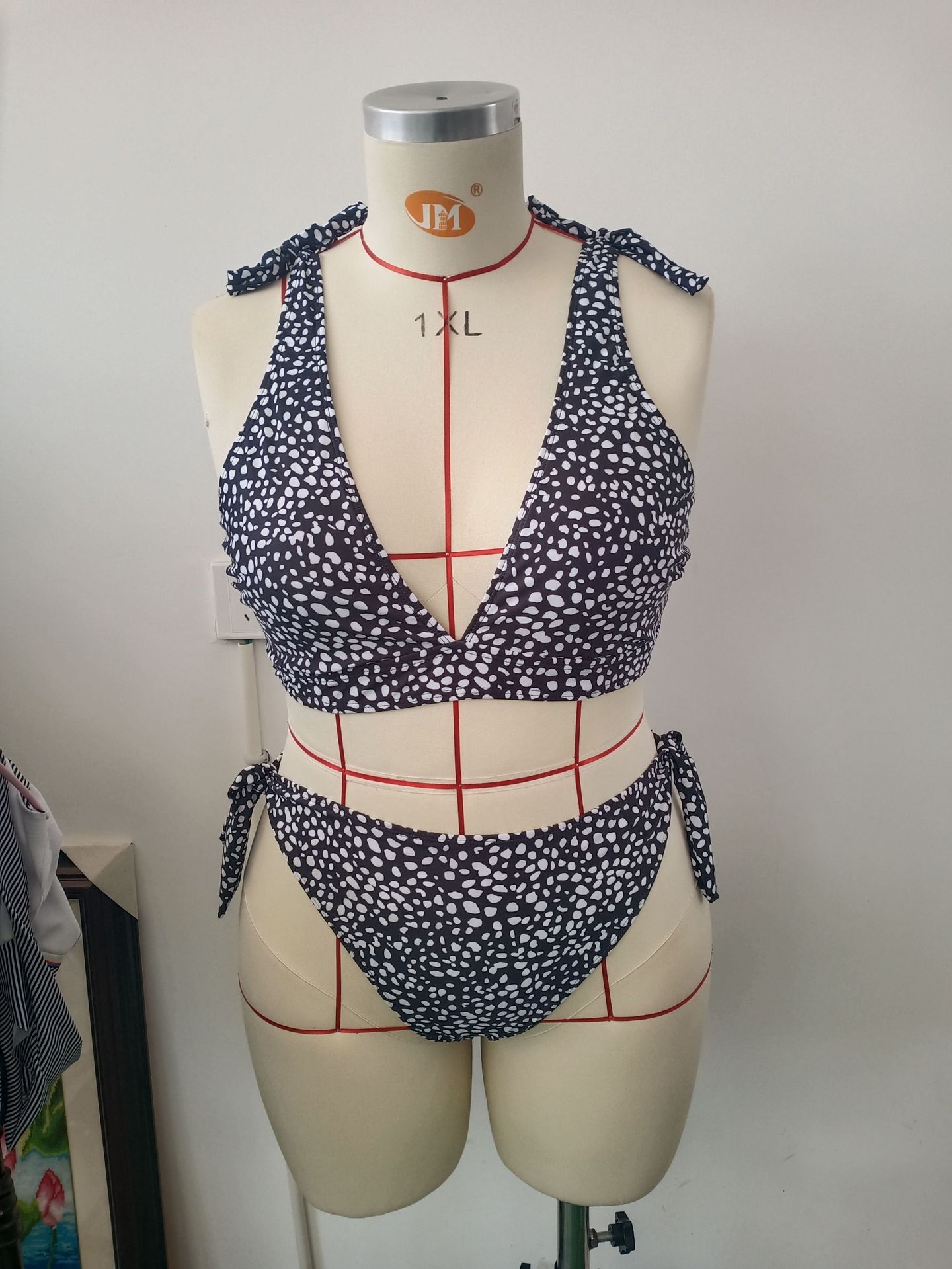 跨境外贸大码波点分体比基尼女吊带性感深V泳衣沙滩两件套泳衣女