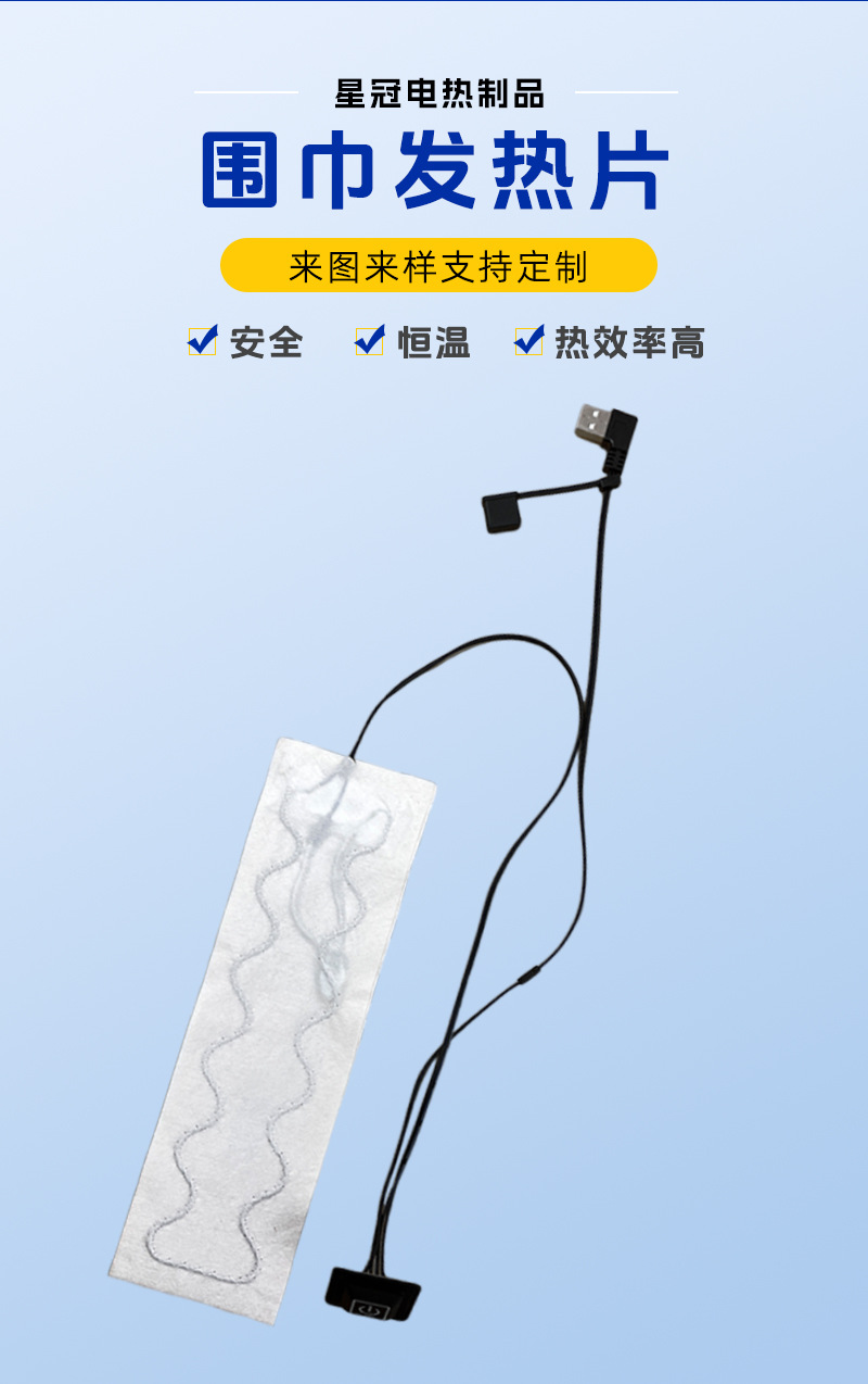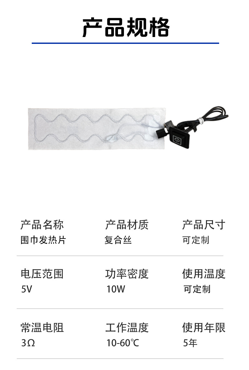 - 应用场景:可内置於日常穿戴、户外活动等场合使用的保暖围巾产品中。