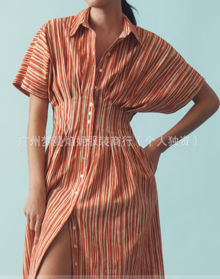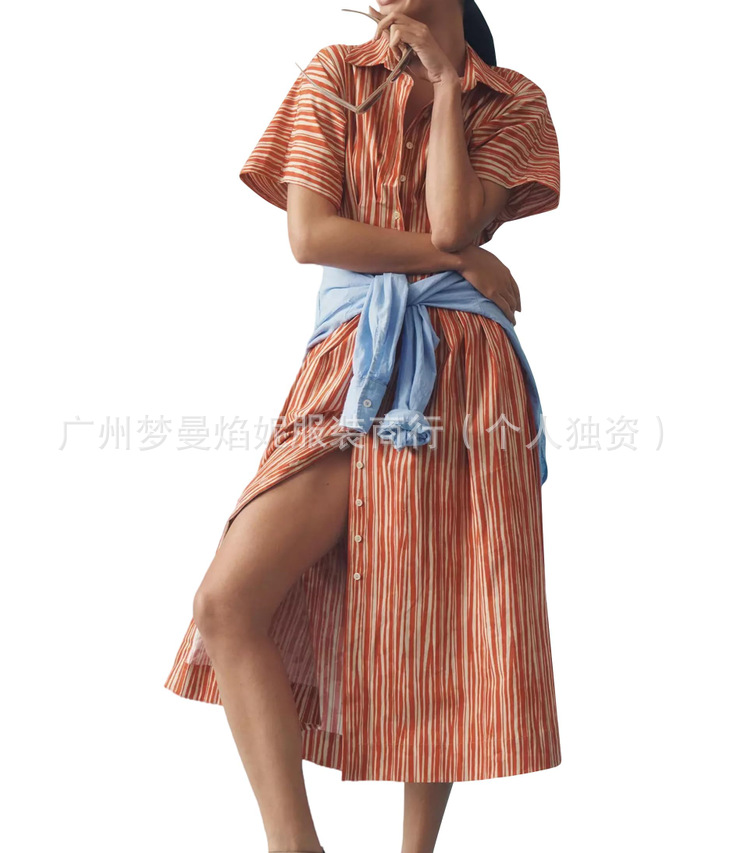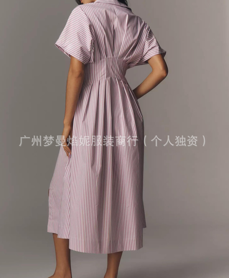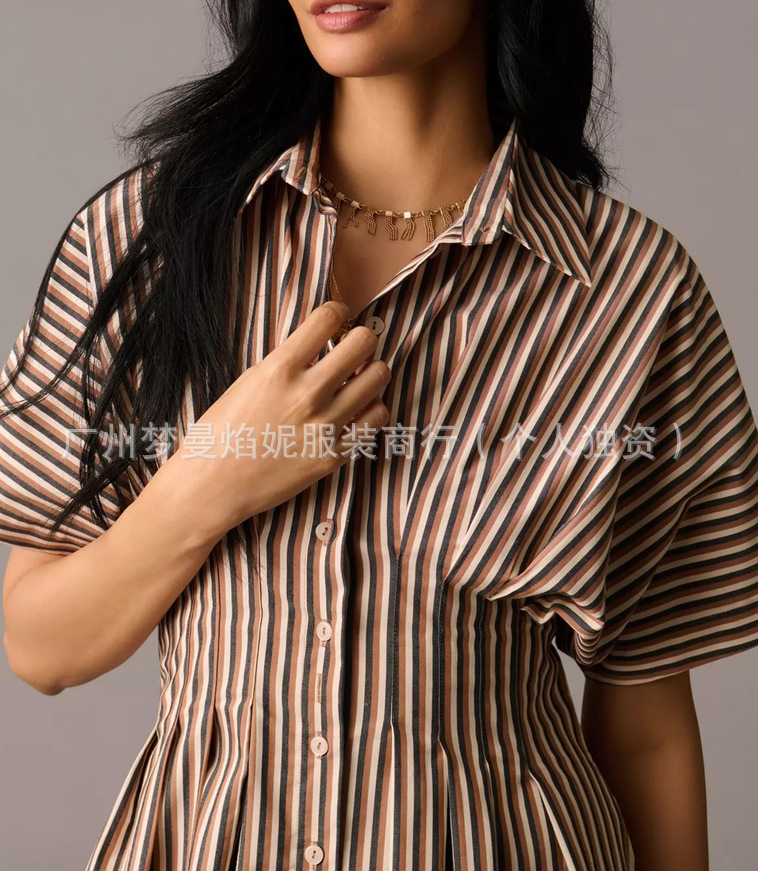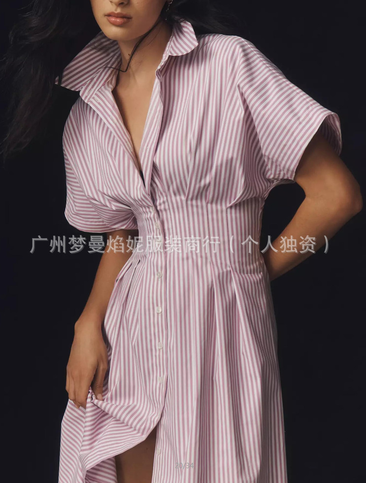 亚马逊跨境2025新品衬衫休闲韩系百搭条纹口袋压褶收腰显瘦长裙女