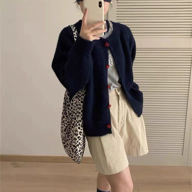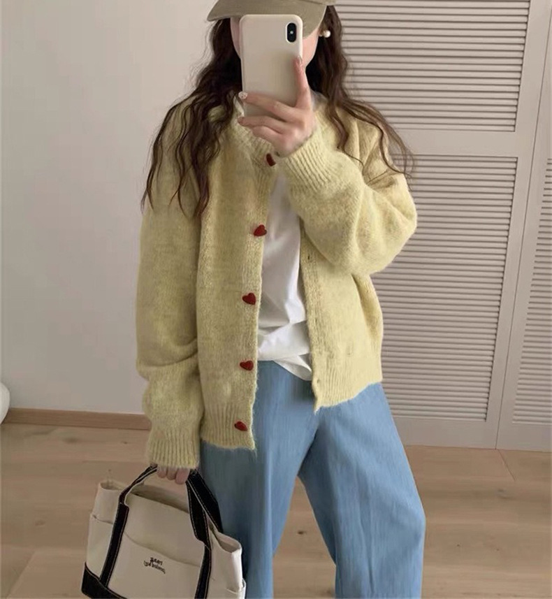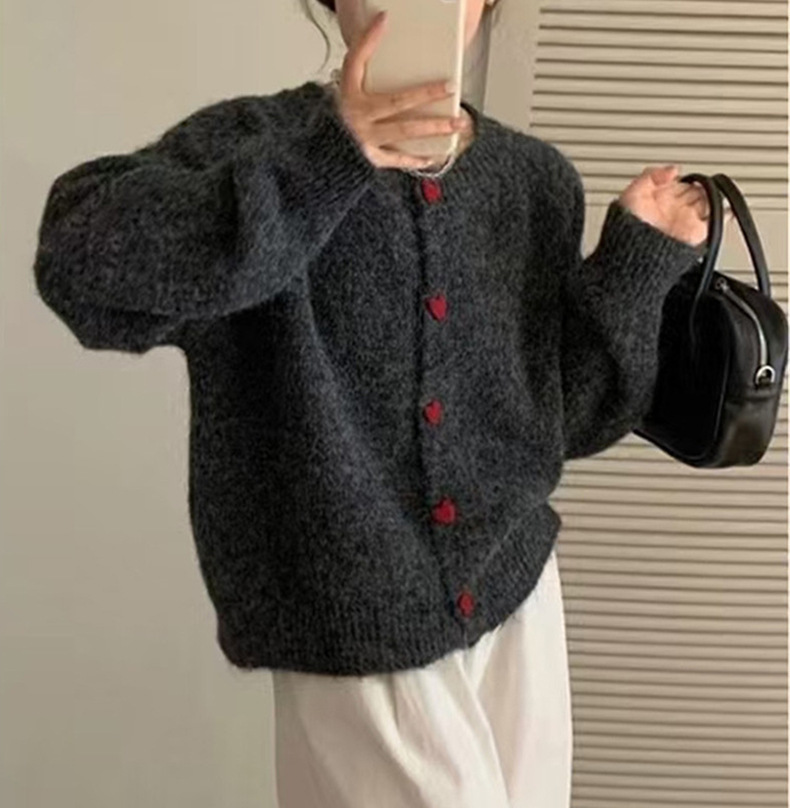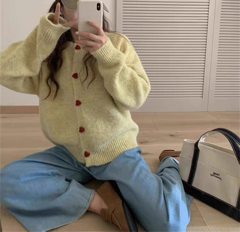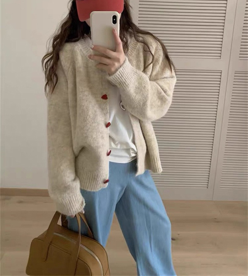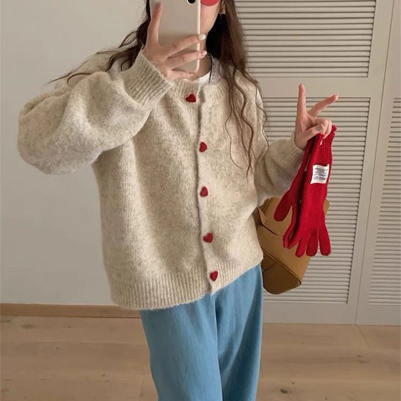 韩版软糯爱心纽扣圆领毛衣外套女秋季新款设计感慵懒宽松针织开衫
