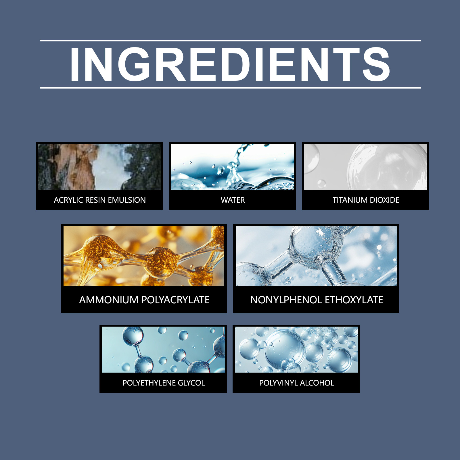 - 主要成分:丙烯酸树脂乳液、水剂、二氧化钛、聚丙烯酸酯铵、壬基酚聚氧乙烯醚、聚乙二醇、聚乙烯醇