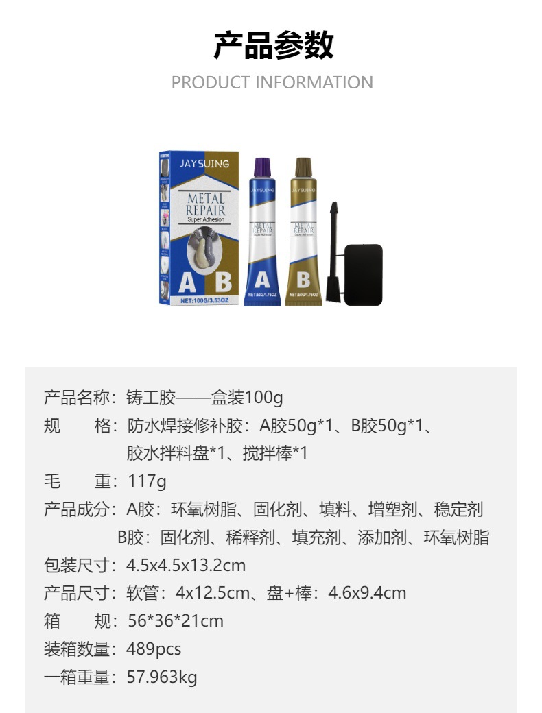 Jaysuing 铸工胶 盒装铸铁密封胶ab胶防补剂补漏堵漏金属粘合胶水