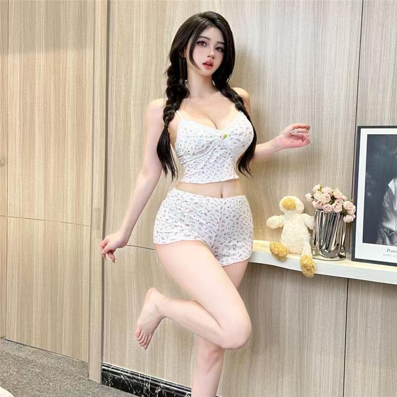 新款性感纯欲风小碎花紧身显瘦无袖少女吊带短裤甜美法式套装批发