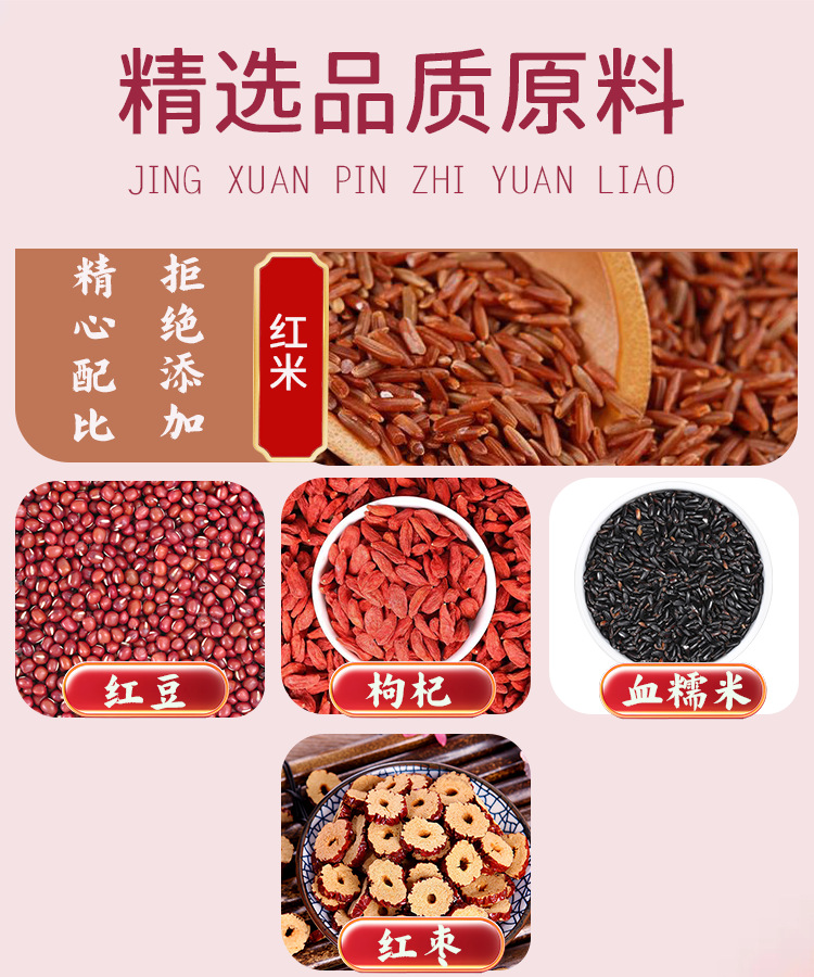 - 原料与配料:血糯米、红豆、红枣、枸杞、红米