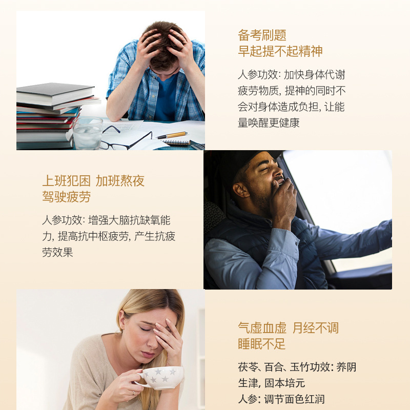- 主要原料:人参(人工种植)、茯苓、百合、玉竹、甘草