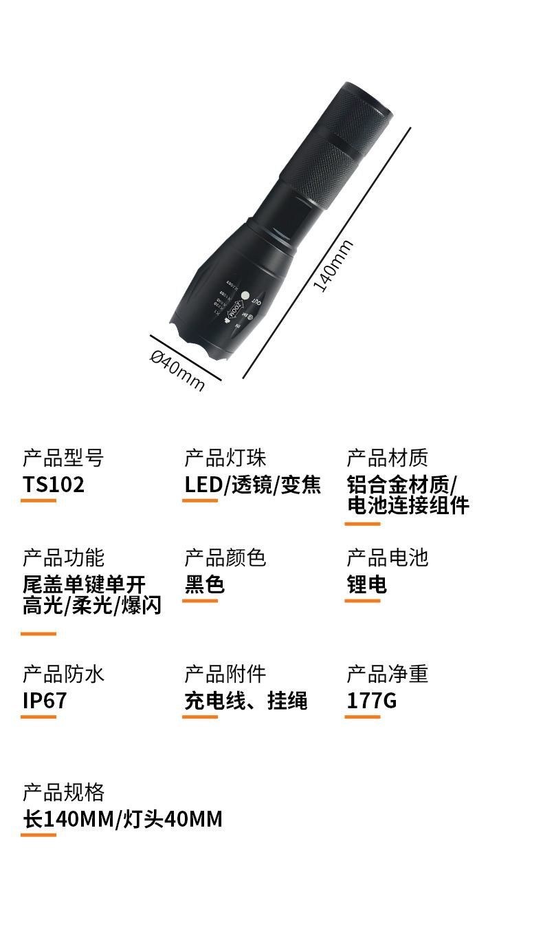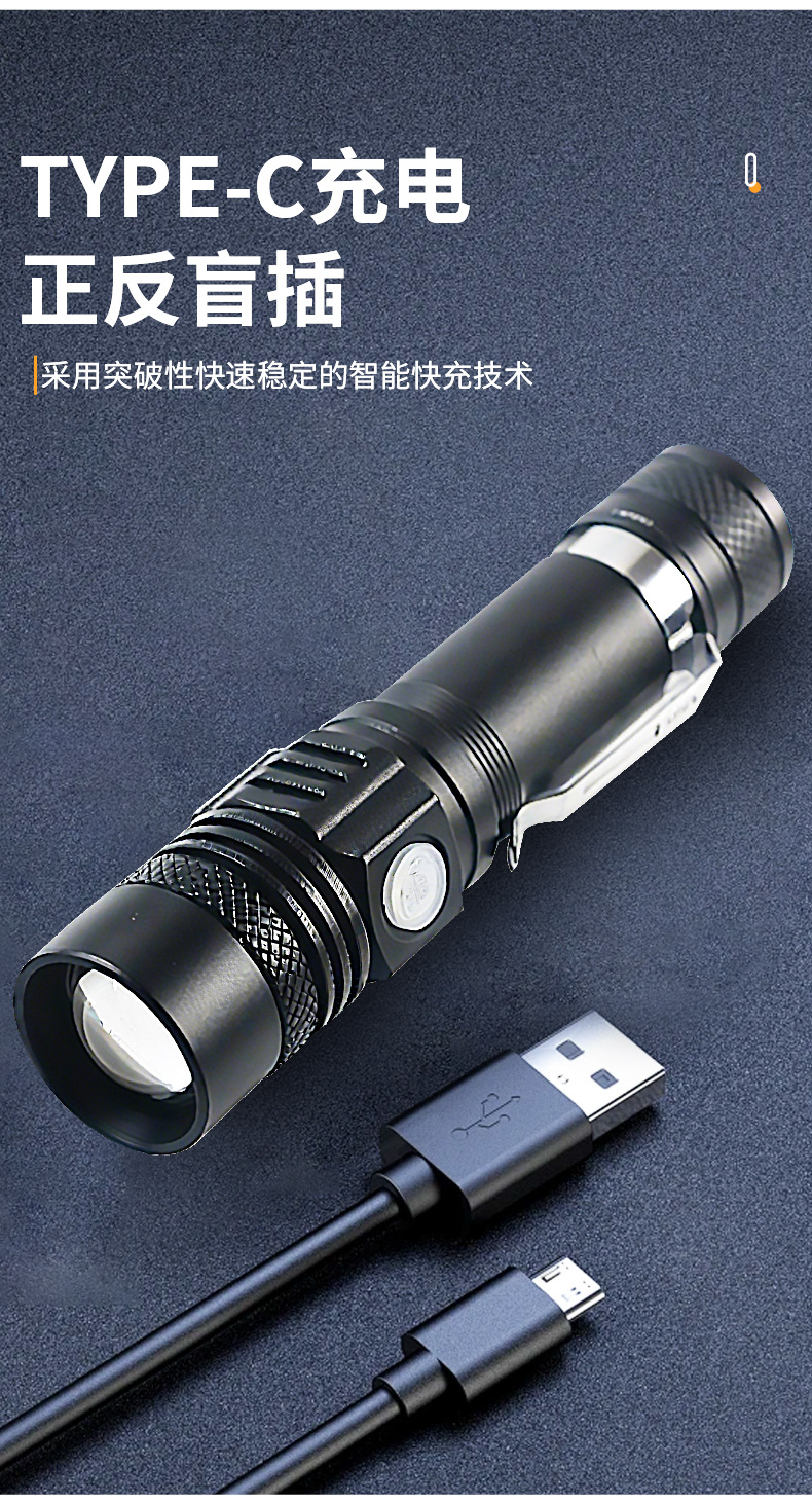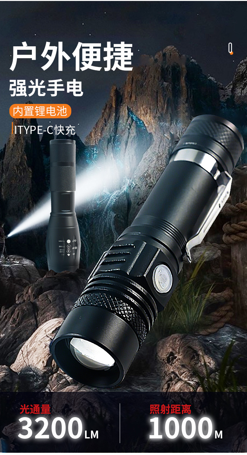铝合金手电筒透镜变焦多功能户外电筒夜跑骑行巡逻探照灯手电批发