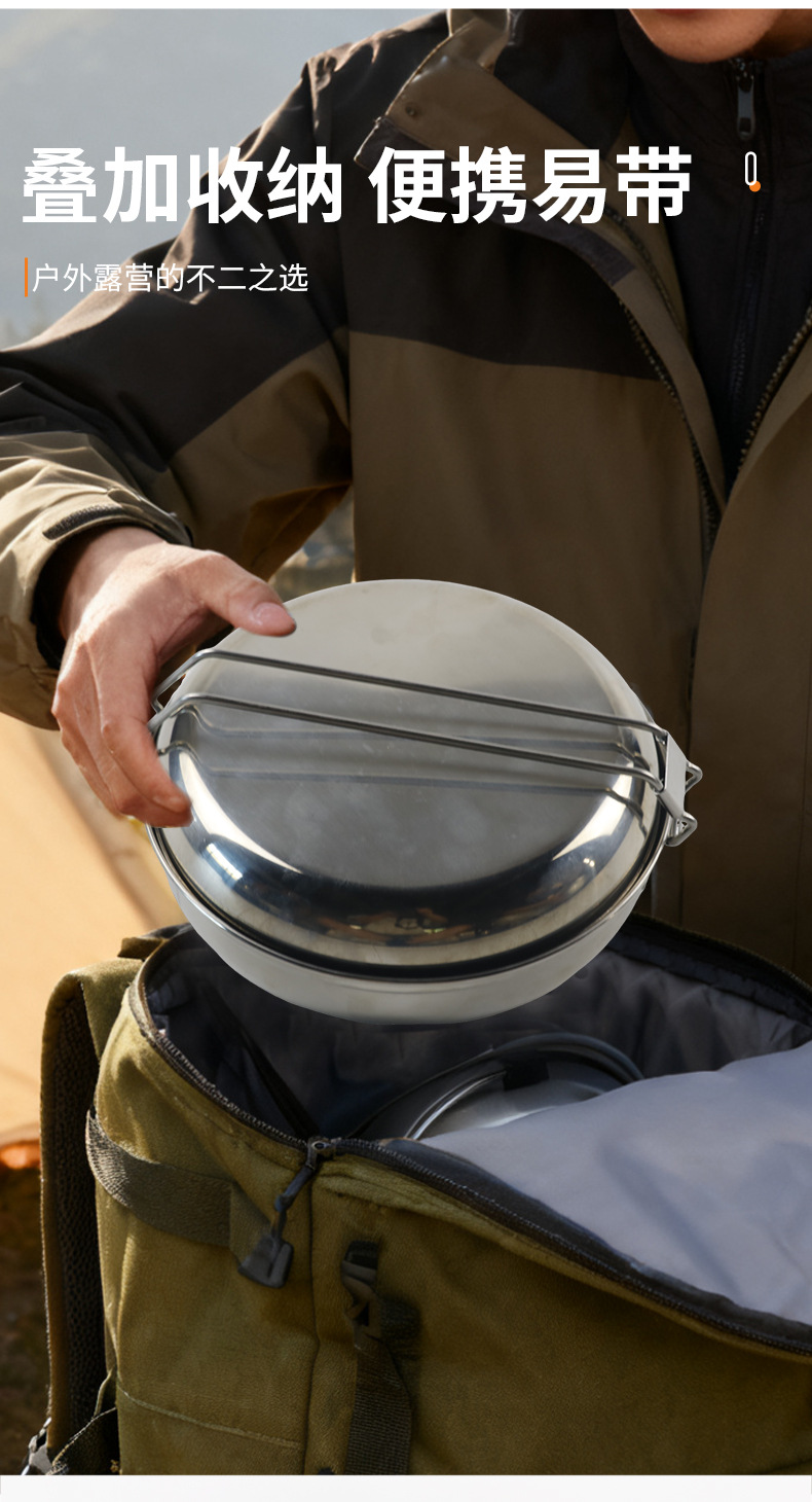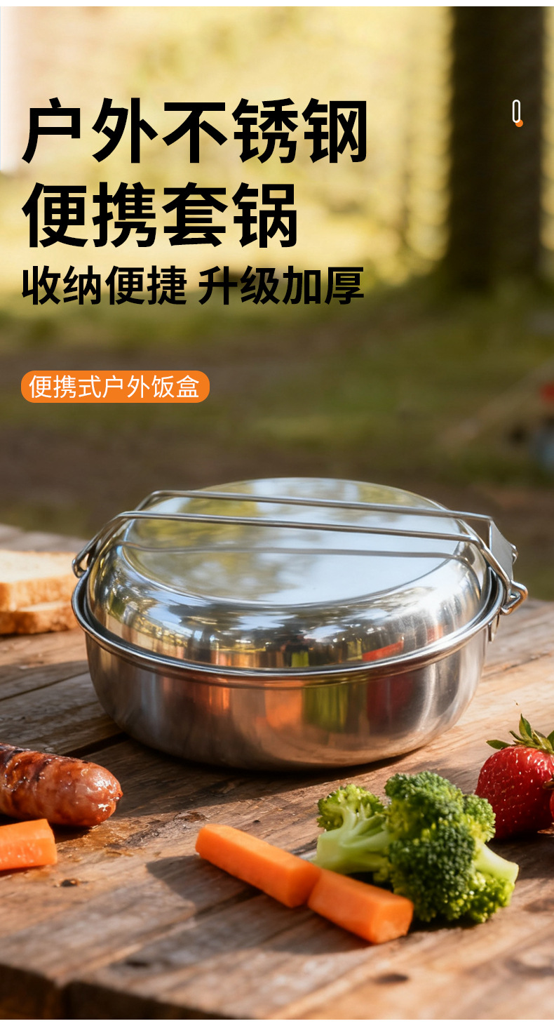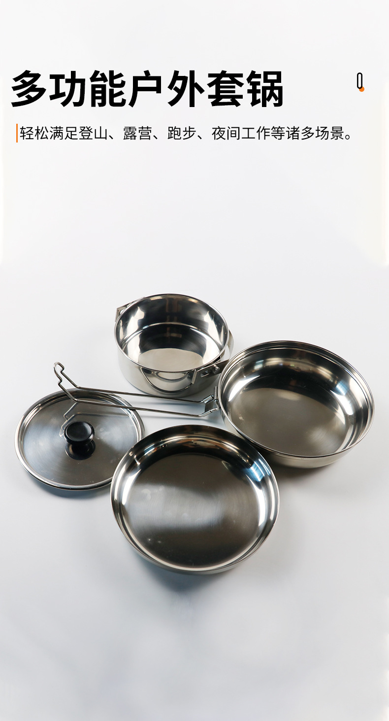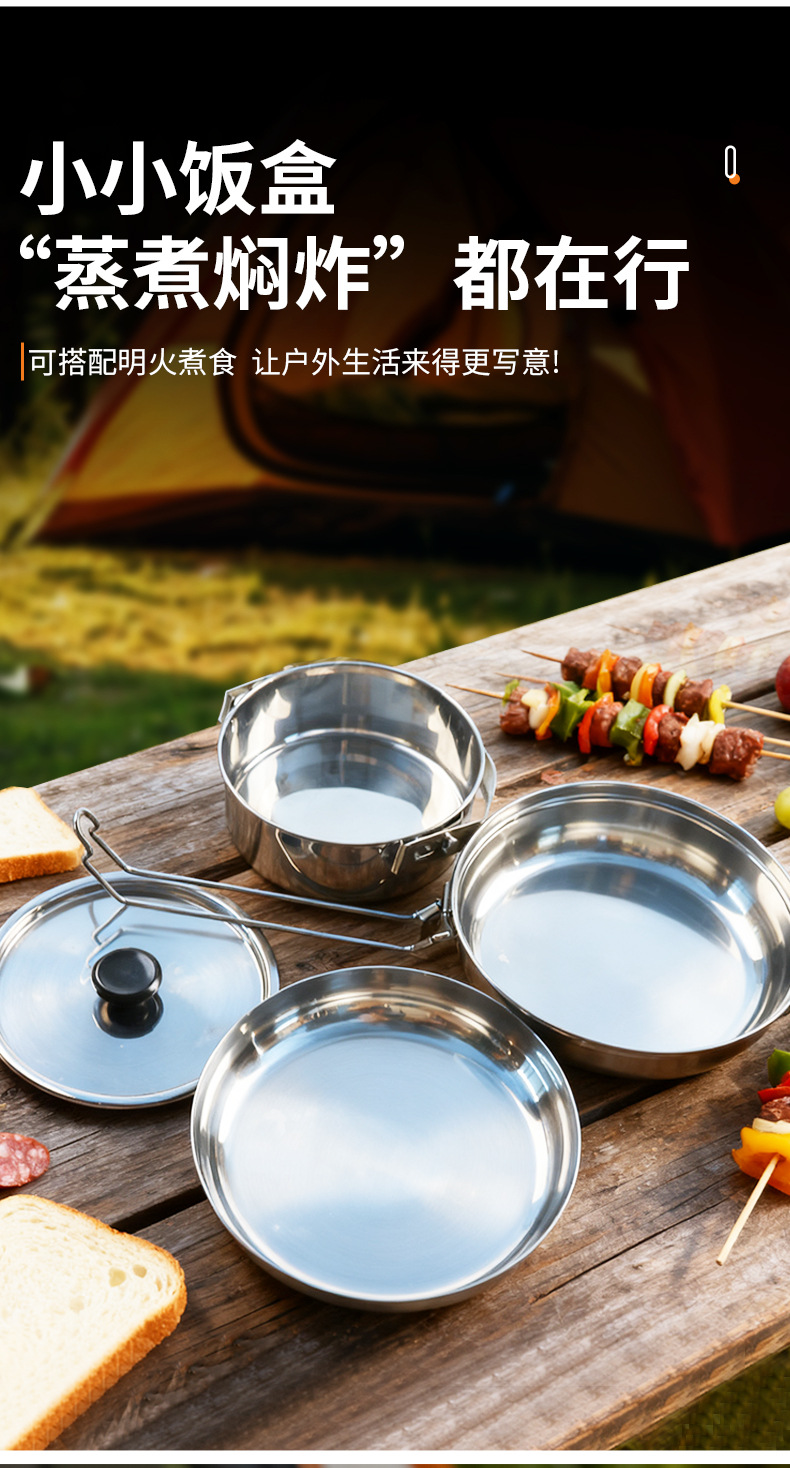 跨境不锈钢圆形饭盒套装山地野营便携式美式分体式锅具户外炊具