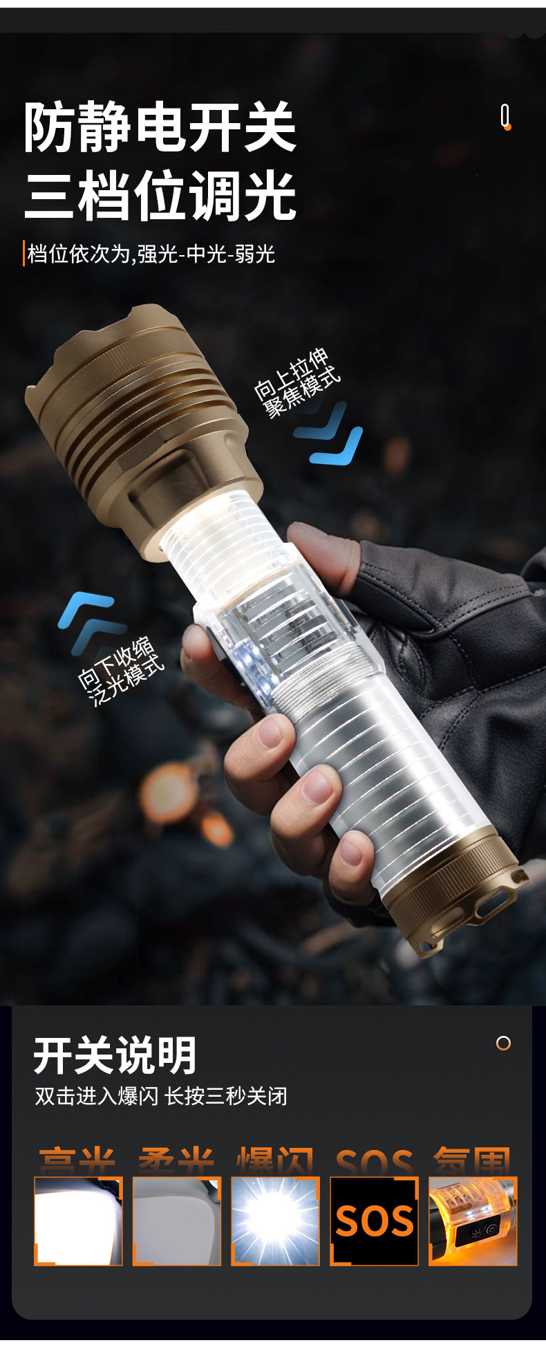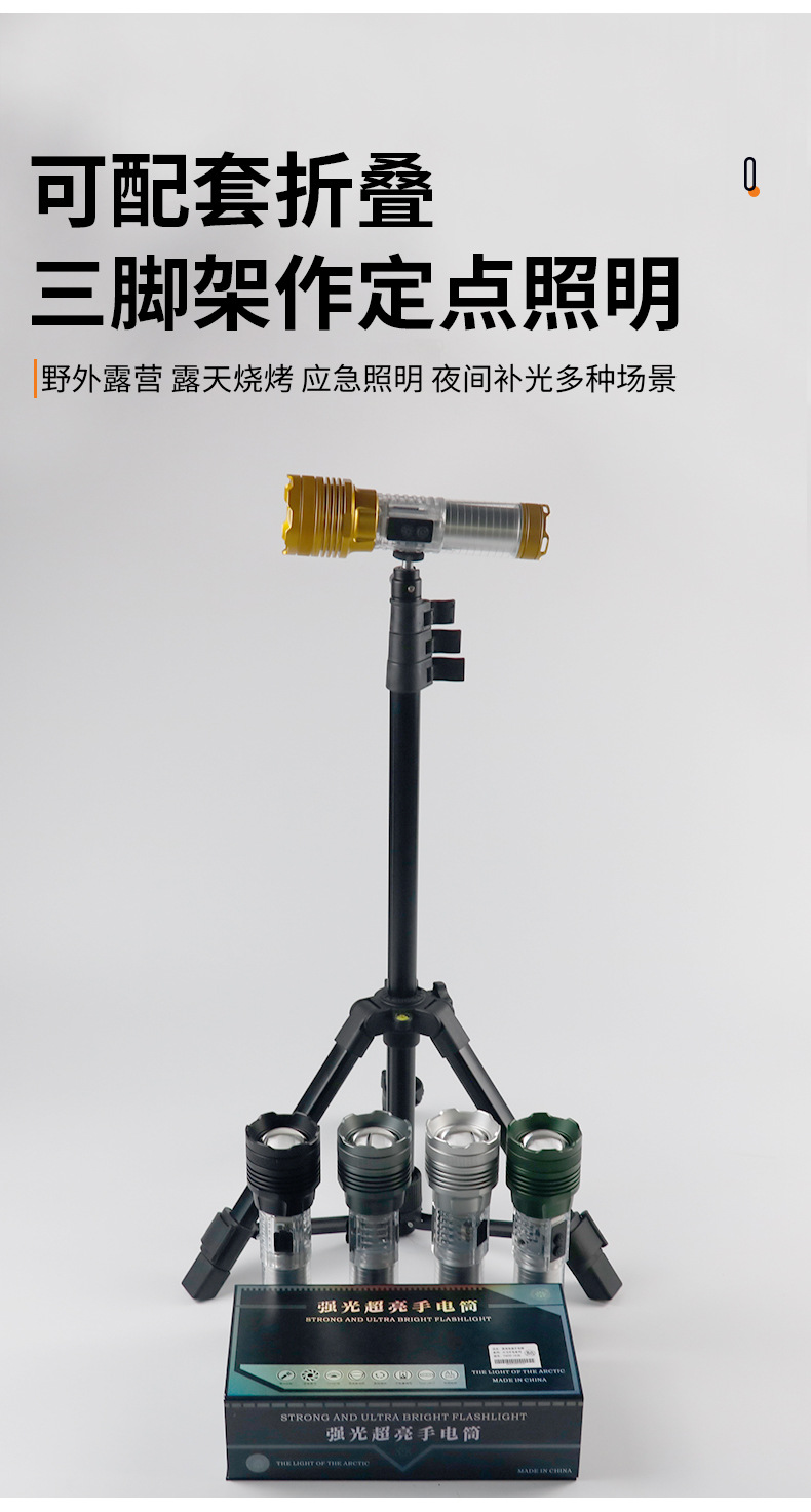 手握式电筒户外灯头伸缩变焦可配套折叠三脚架氛围灯双色手电筒