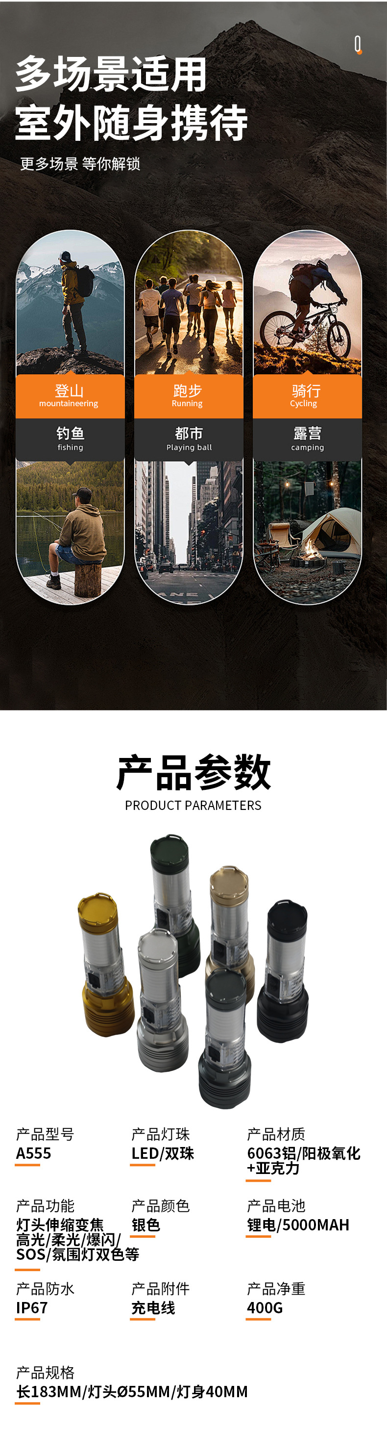- 颜色:A555银色/灯头伸缩变焦/充电线+挂绳