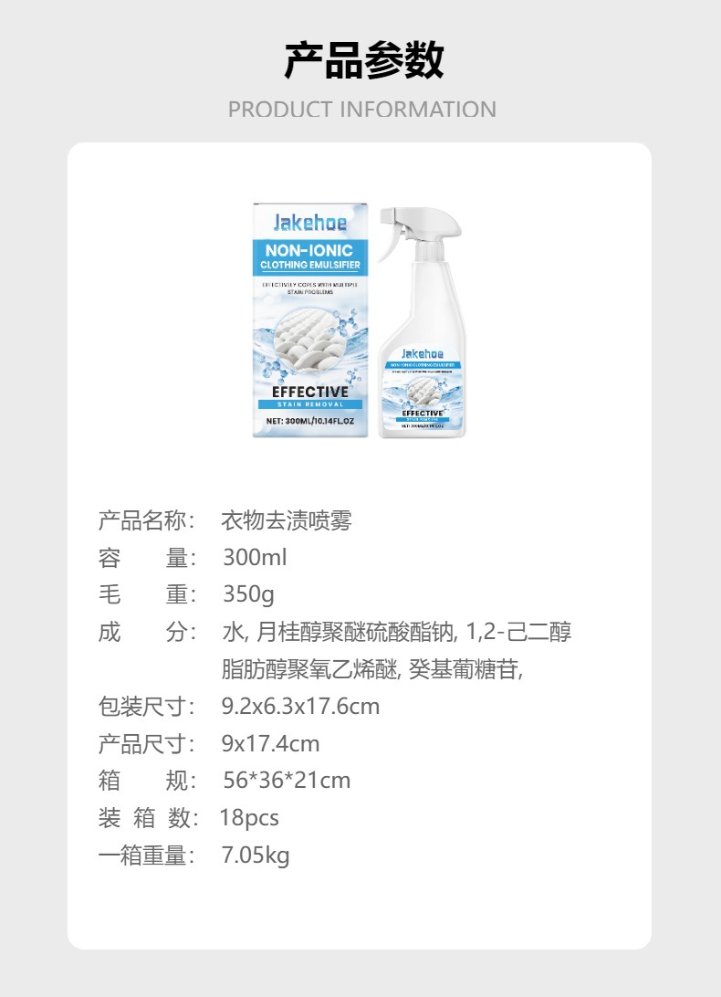 JAKEHOE衣物去渍喷雾 家用衣服清洁快速去污油渍焕新亮彩洁净喷雾