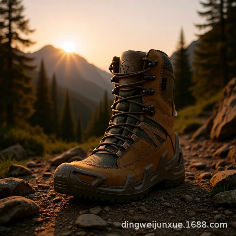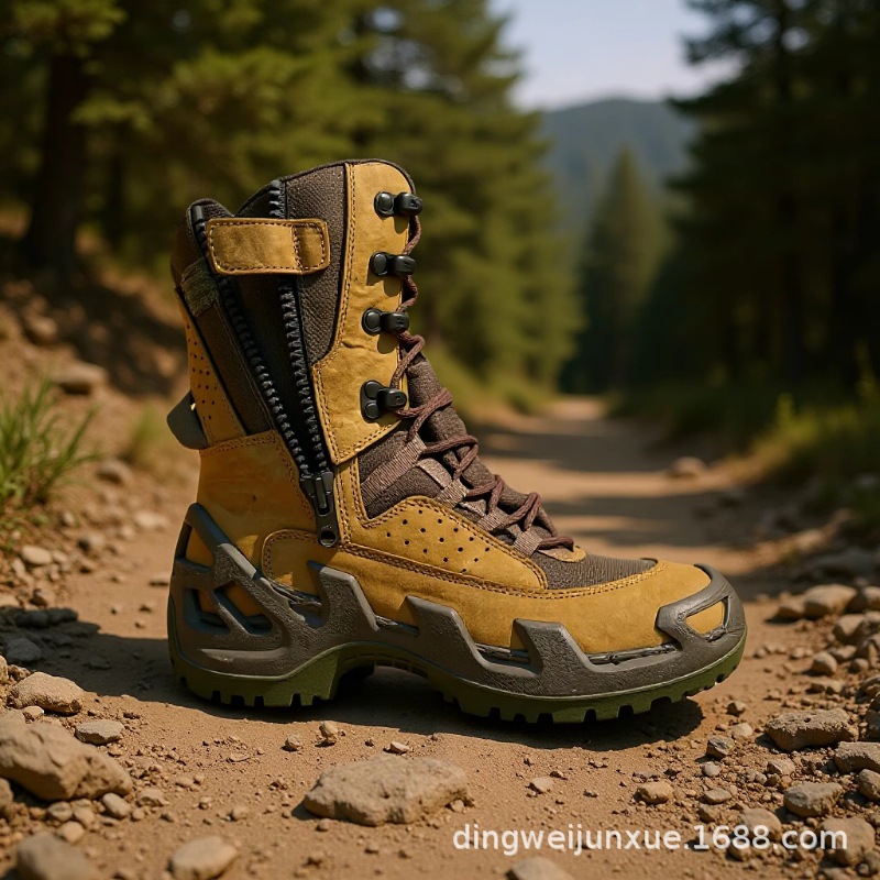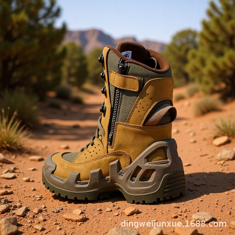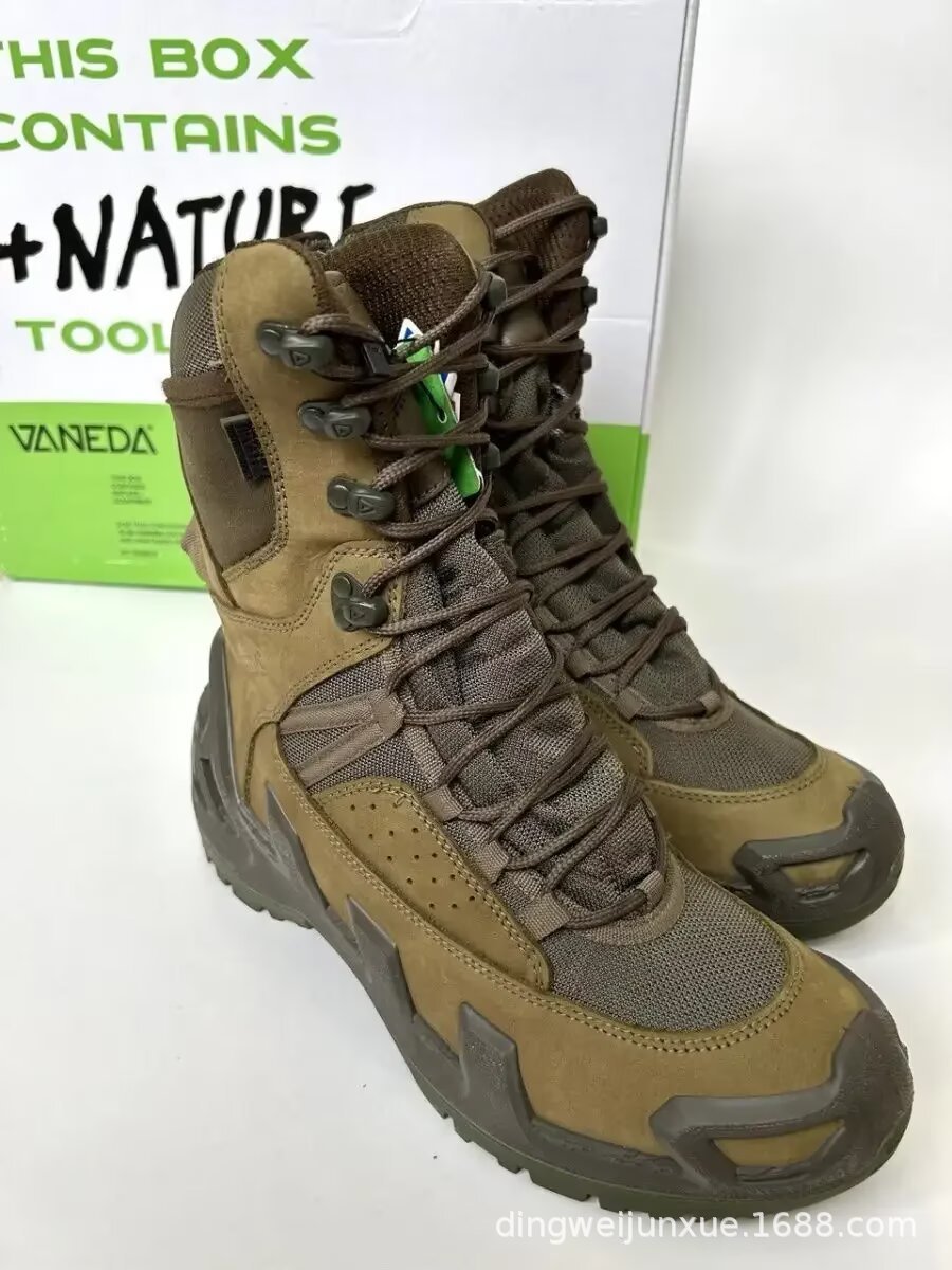 VANEDA军靴以透气、防滑、减震为核心功能,内垫采用网布海玻丽材料(吸汗抗菌),大底为聚氨酯树脂(耐磨防滑),适合户外工作及军事场景147。其设计符合人体工学,鞋植采用第五代8005型号贴合脚型17。