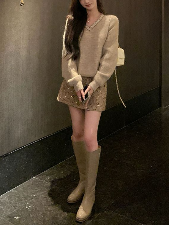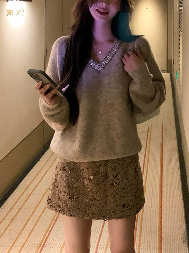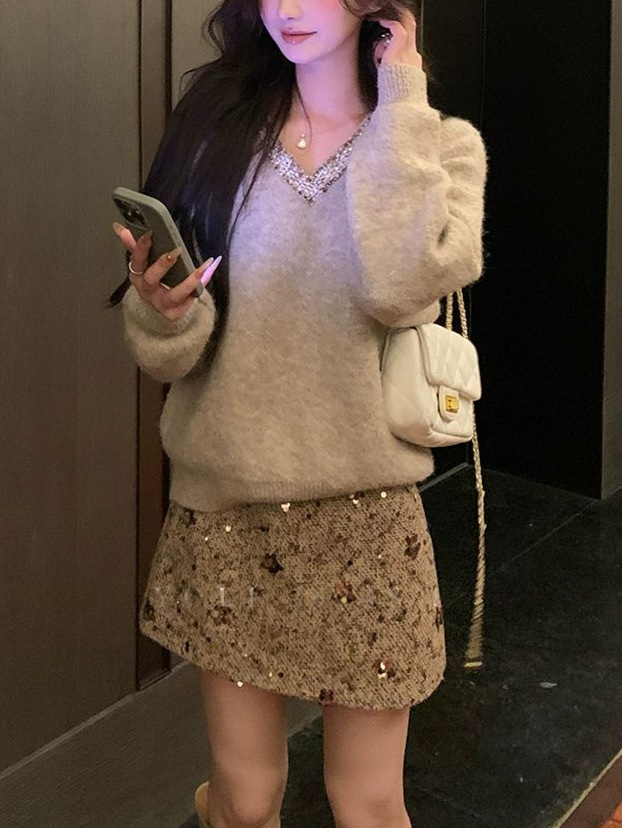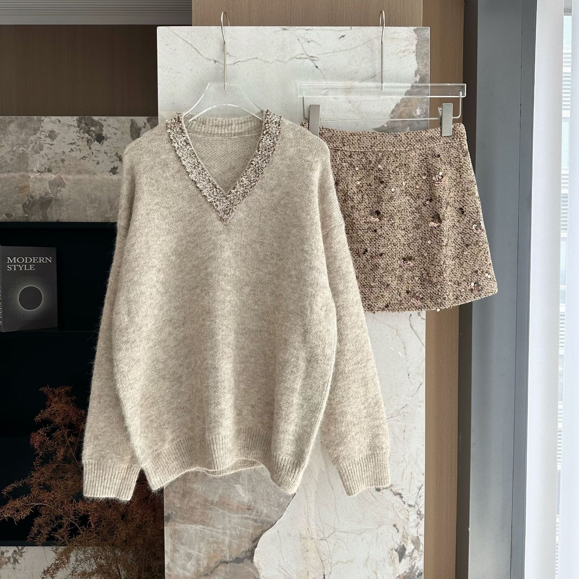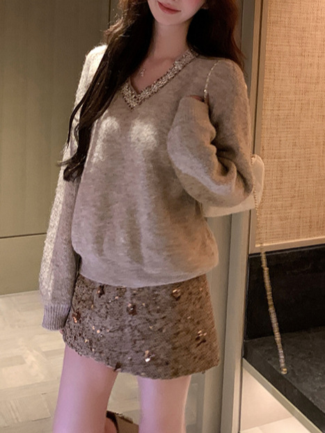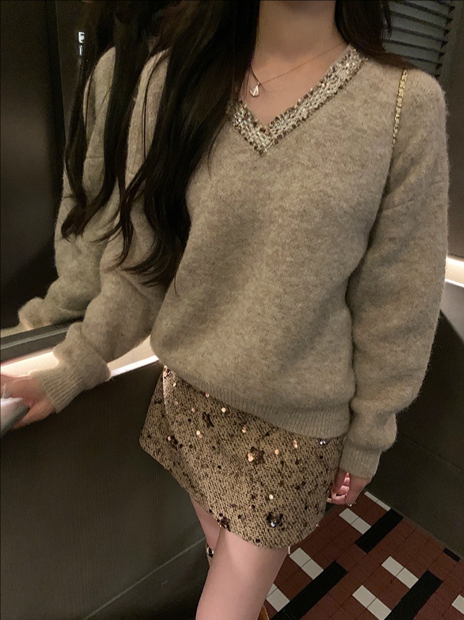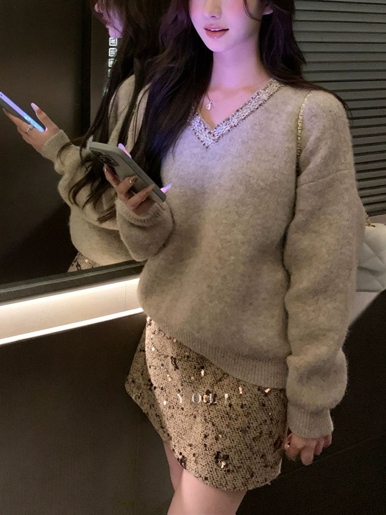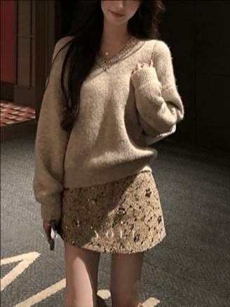 YOI "驼棕松弛感"羊毛混纺v领毛衣女秋季慵懒宽松套头上衣