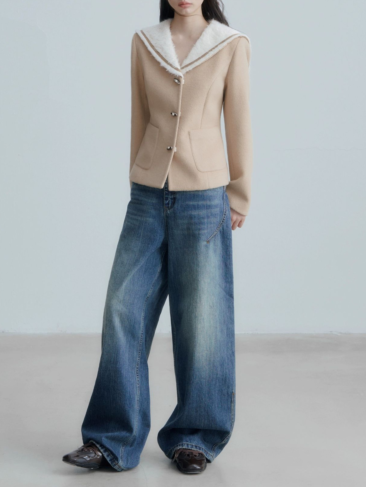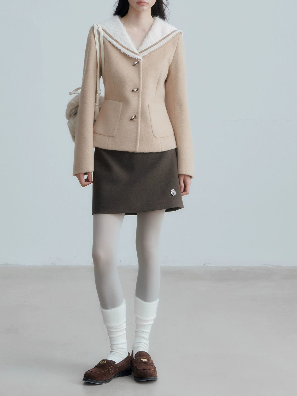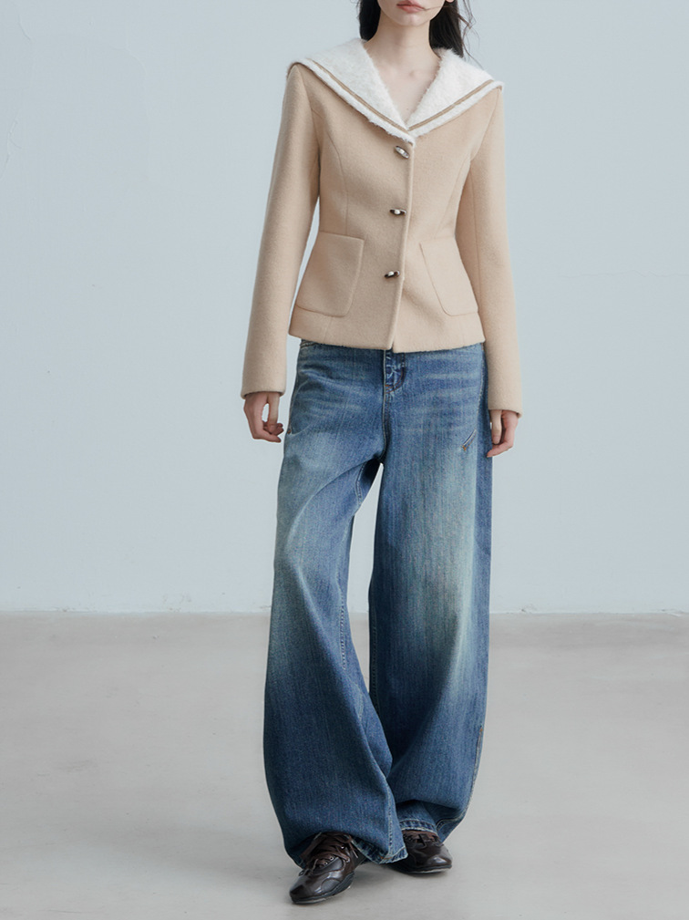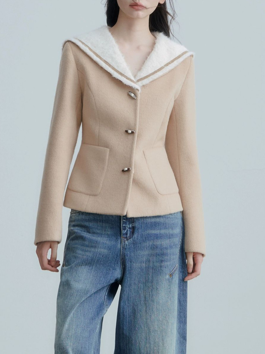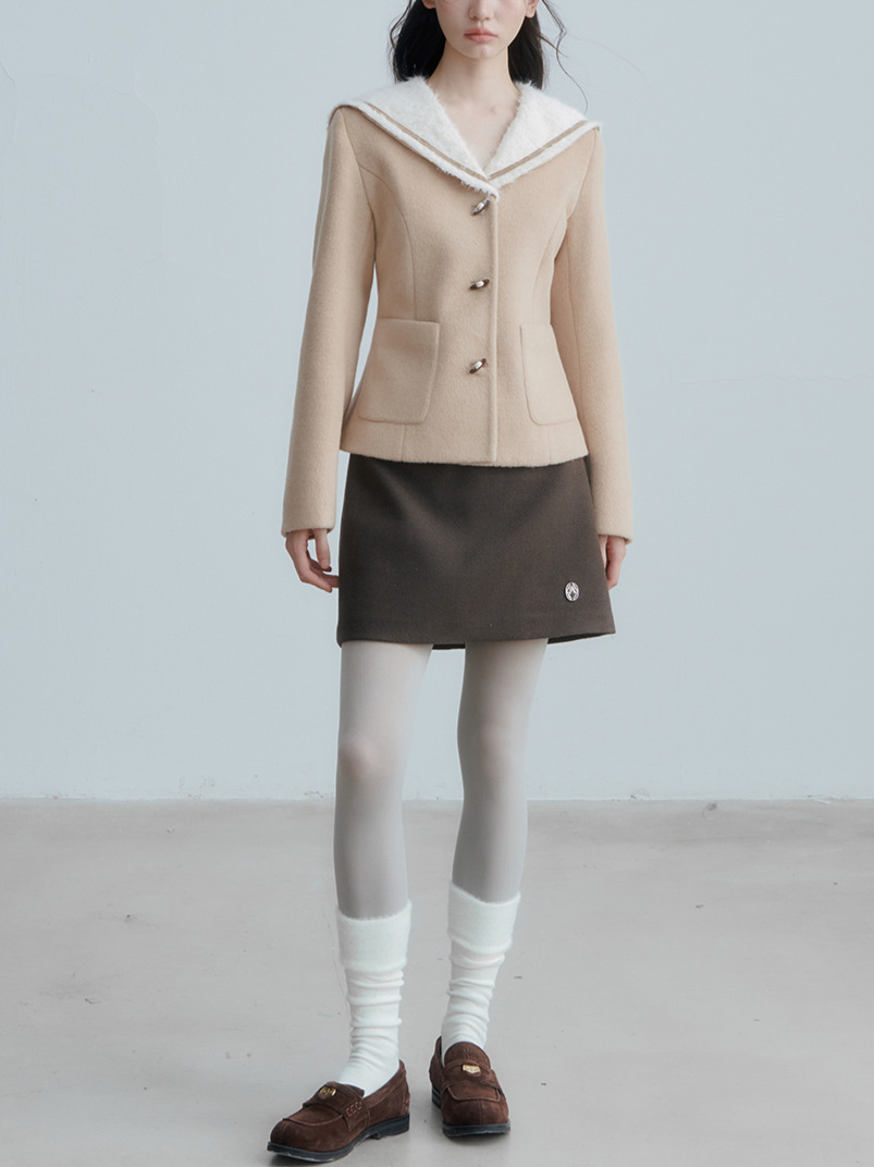 ANNATO 秋冬季新款学院风卡其色海军领收腰显瘦短款羊毛外套女