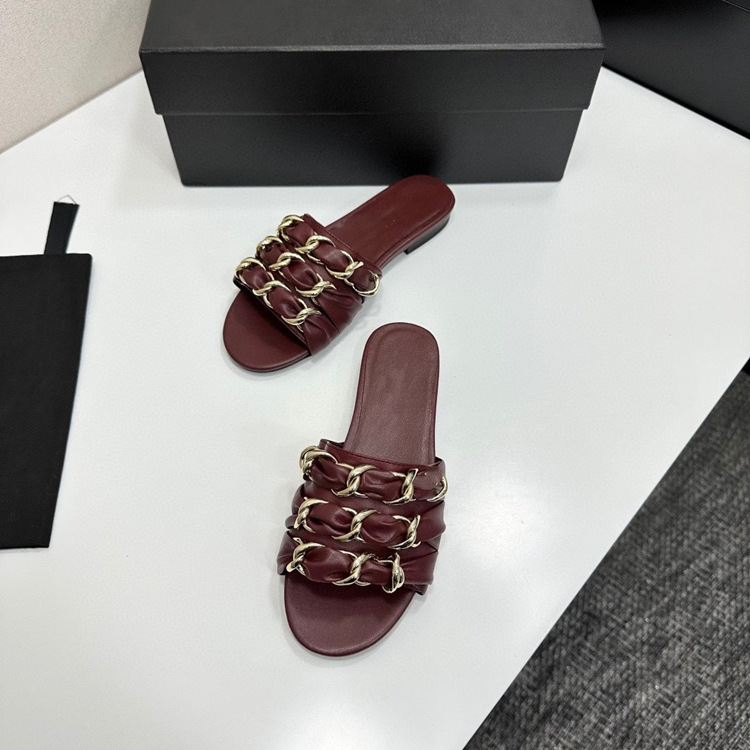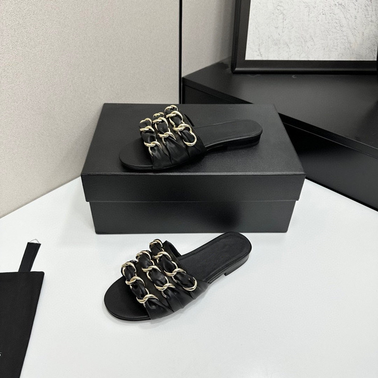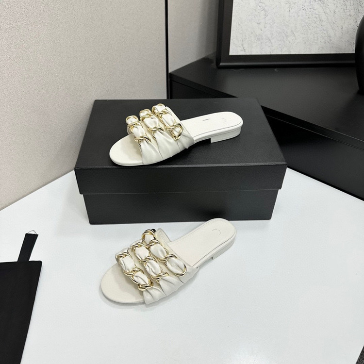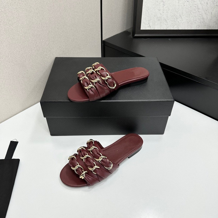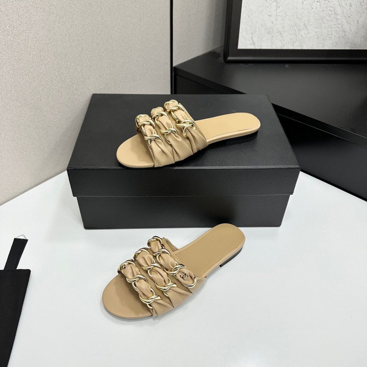 高品质广州工厂2026新款金属链条平底拖鞋真皮一字拖外穿凉鞋