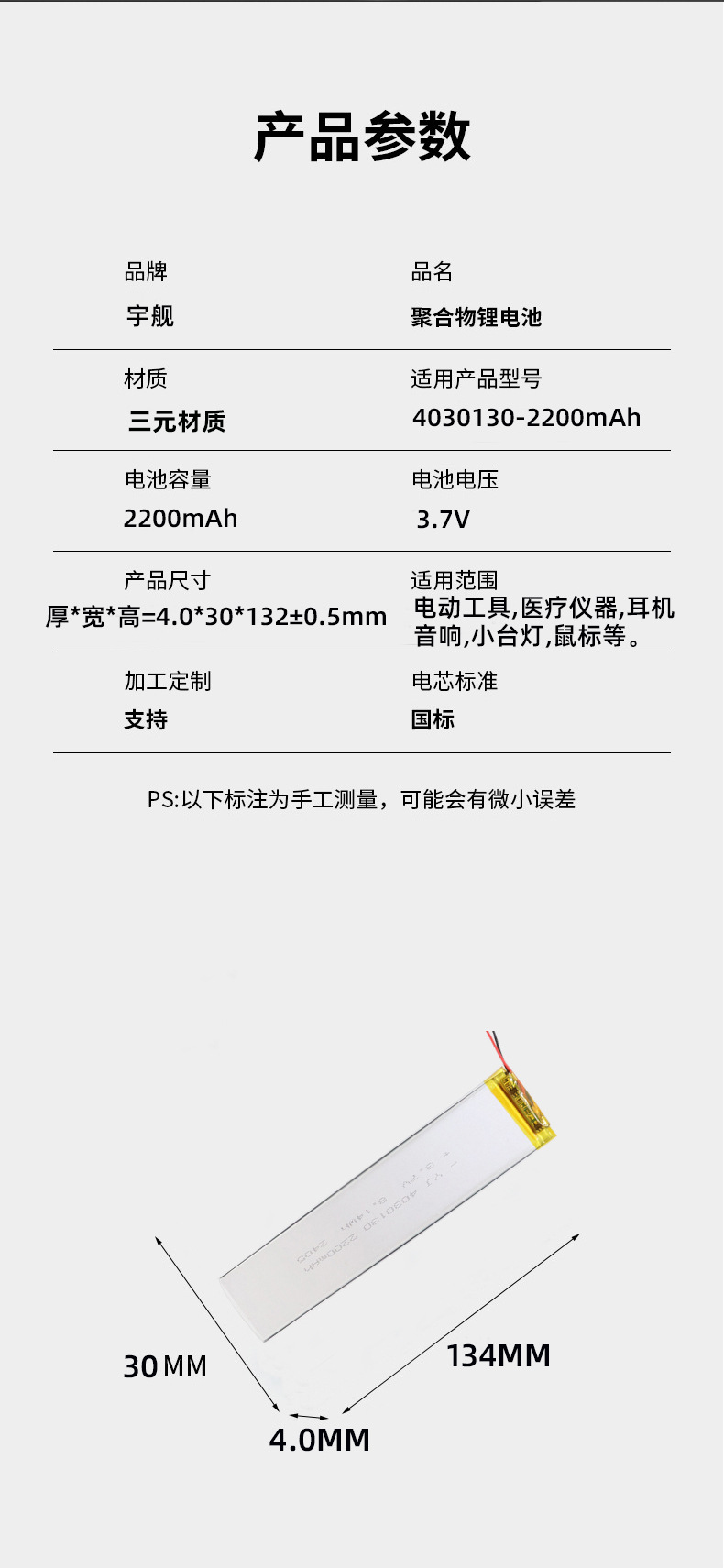 厂家直供4030130锂电池3.7V高容量蓝牙键盘电池唱戏机音响电池