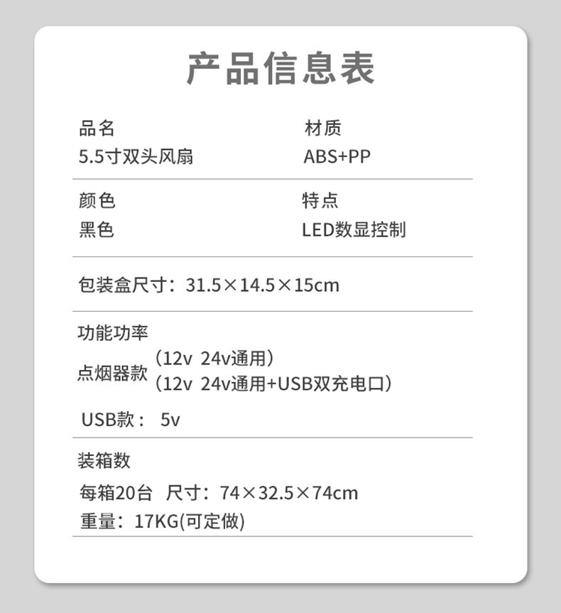 - 规格尺寸:自动摇头24V+充电口 点烟器插头