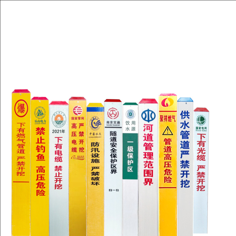- 产品特点:该产品采用高强度玻璃钢材质制成,具有抗老化、耐腐蚀的特点,保证了长期使用的稳定性和可靠性。PVC标志桩设计 ,色彩鲜艳,能够在地下隐蔽工程中清晰地标识出管道的位置,起到警示作用。界桩结构坚固,能够有效固定在地面,不易被破坏,提高了工程的安全性和稳定性。