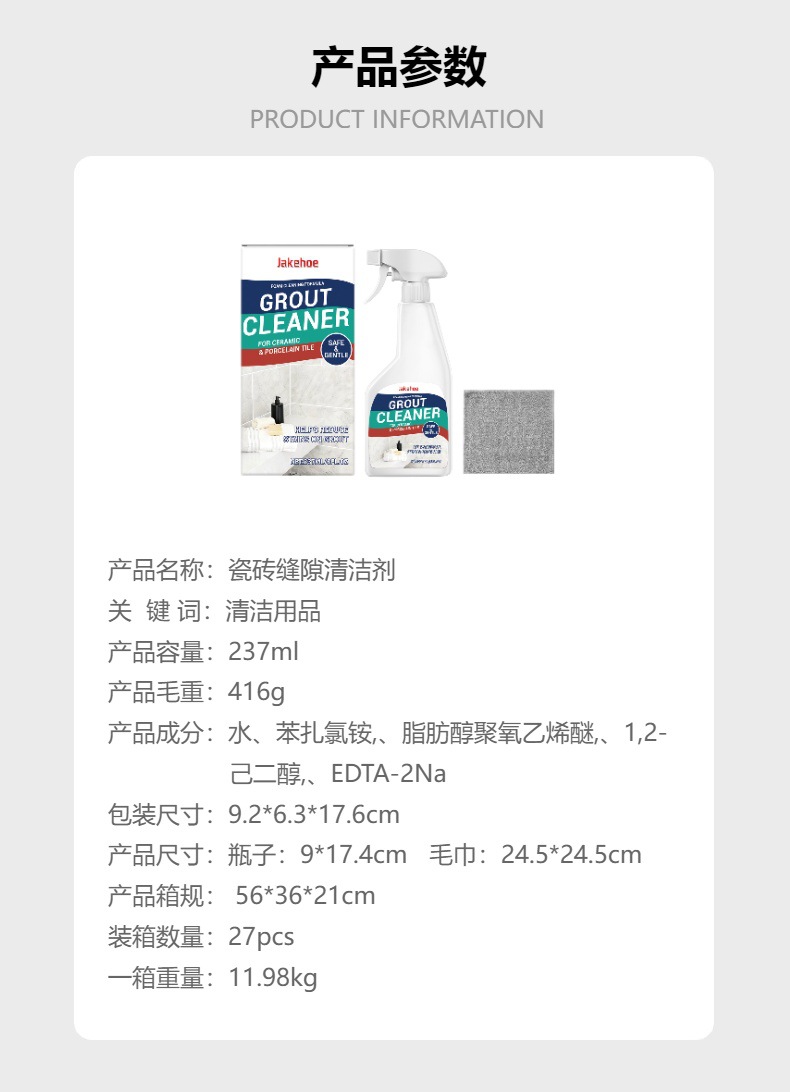JAKEHOE瓷砖缝隙清洁剂 地板瓷砖日常洁净去污美缝温和家用清洁剂