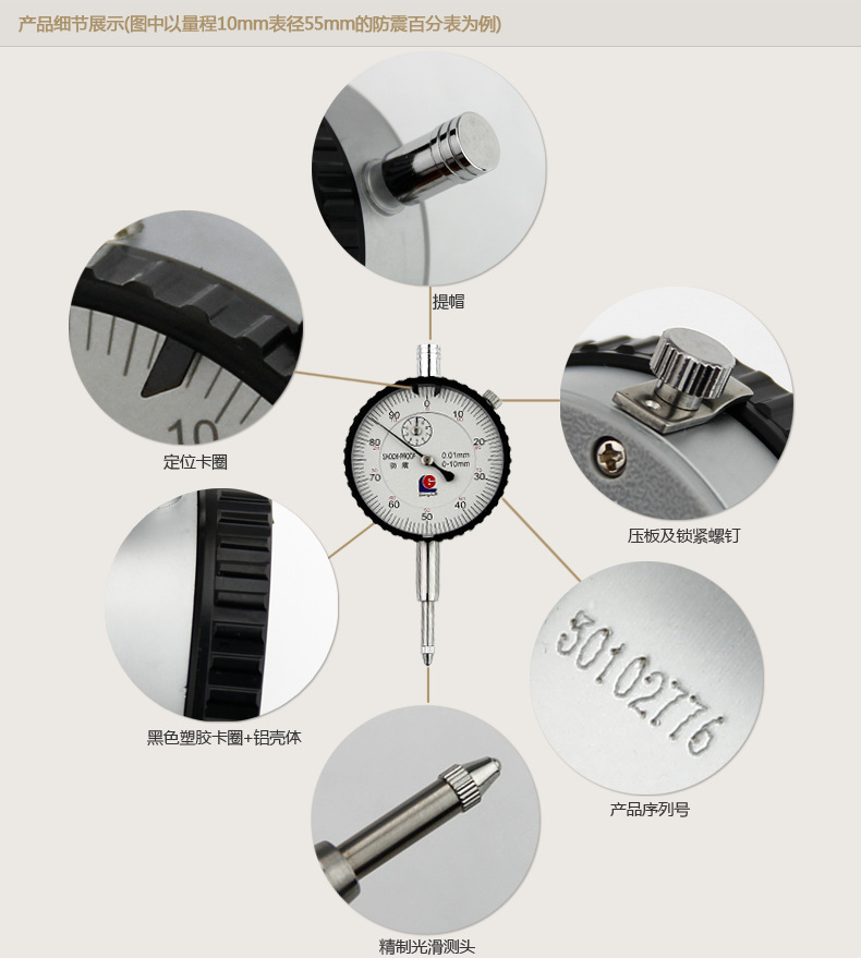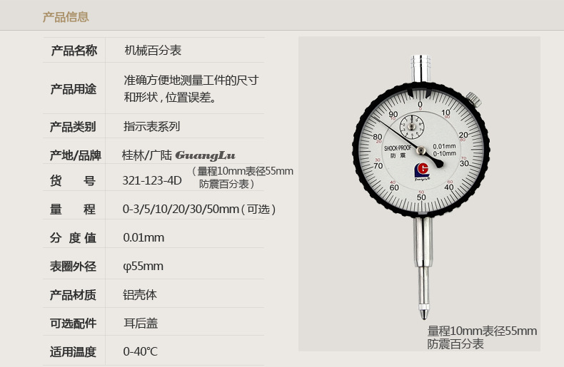 - 规格:量程10mm表径55mm防震