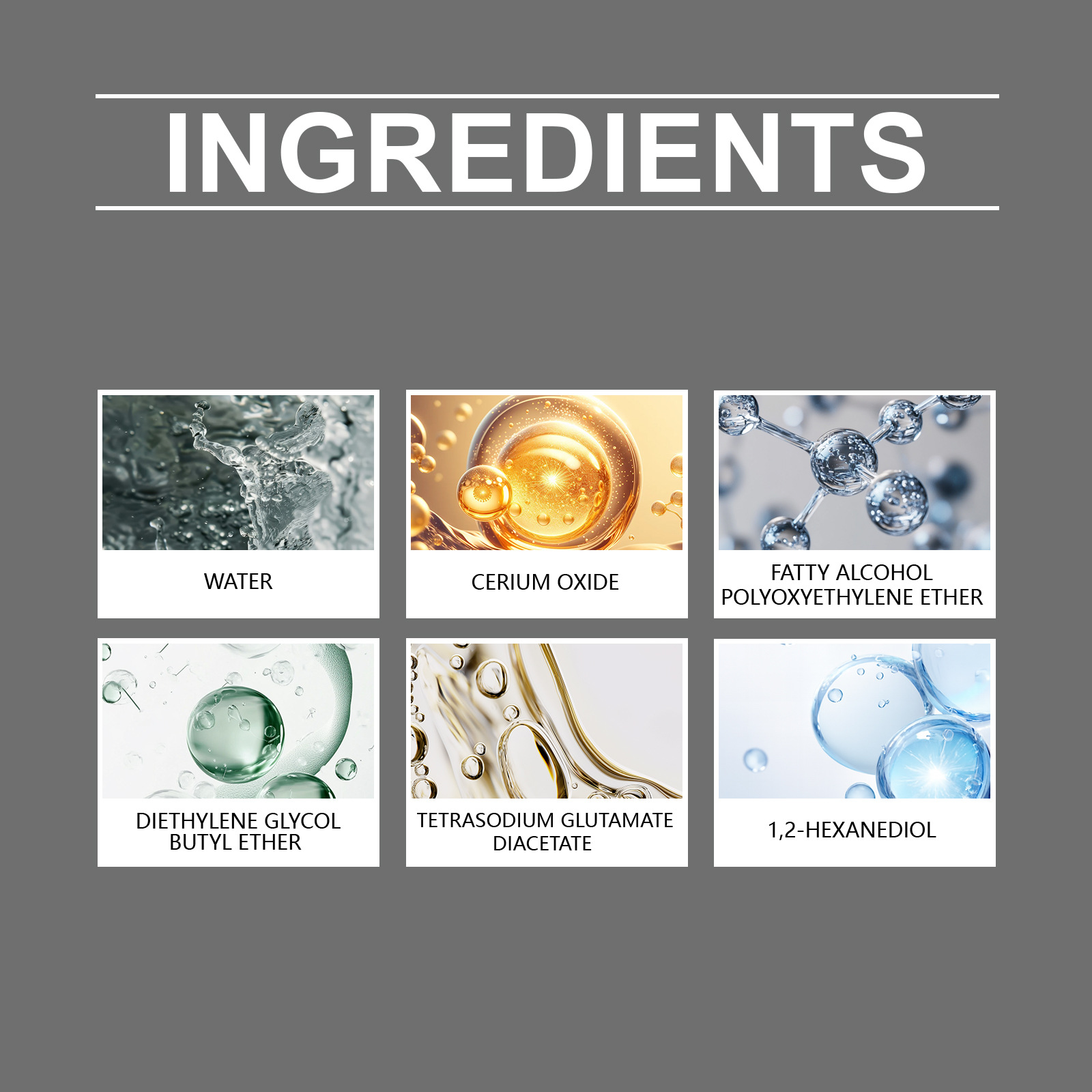- 主要成分:水 、氧化铈 、脂肪醇聚氧乙烯醚 、二乙二醇丁醚 、谷氨酸二乙酸四钠 、1,2-己二醇